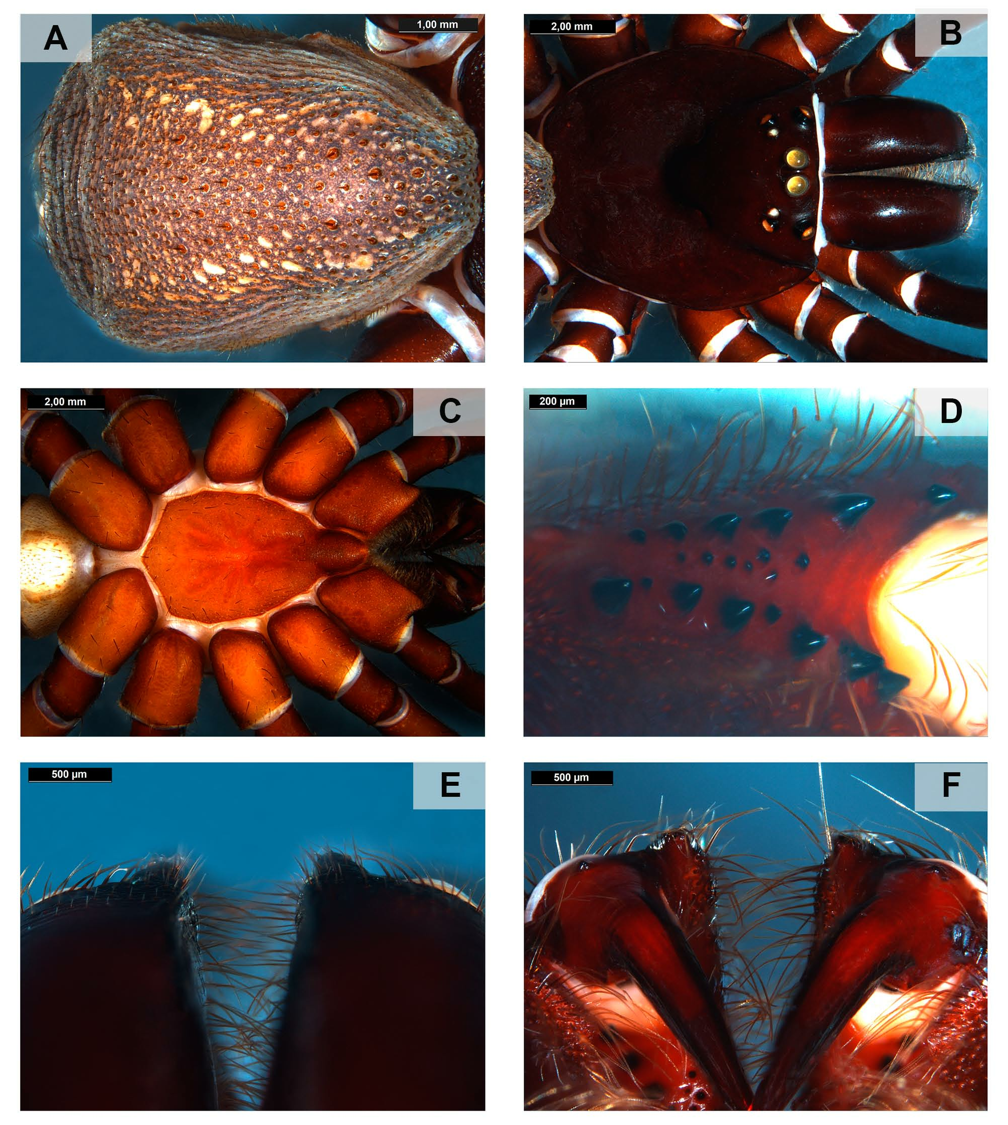 FIGURE 76. Actinopus harveyi sp. nov., male: A–F IBSP 111837: A. Abdomen, dorsal; B. Carapace, dorsal; C. Sternum, ventral; D. Cheliceral teeth, ventral; E. Rastellum, dorsal; F. Rastellum, ventral.