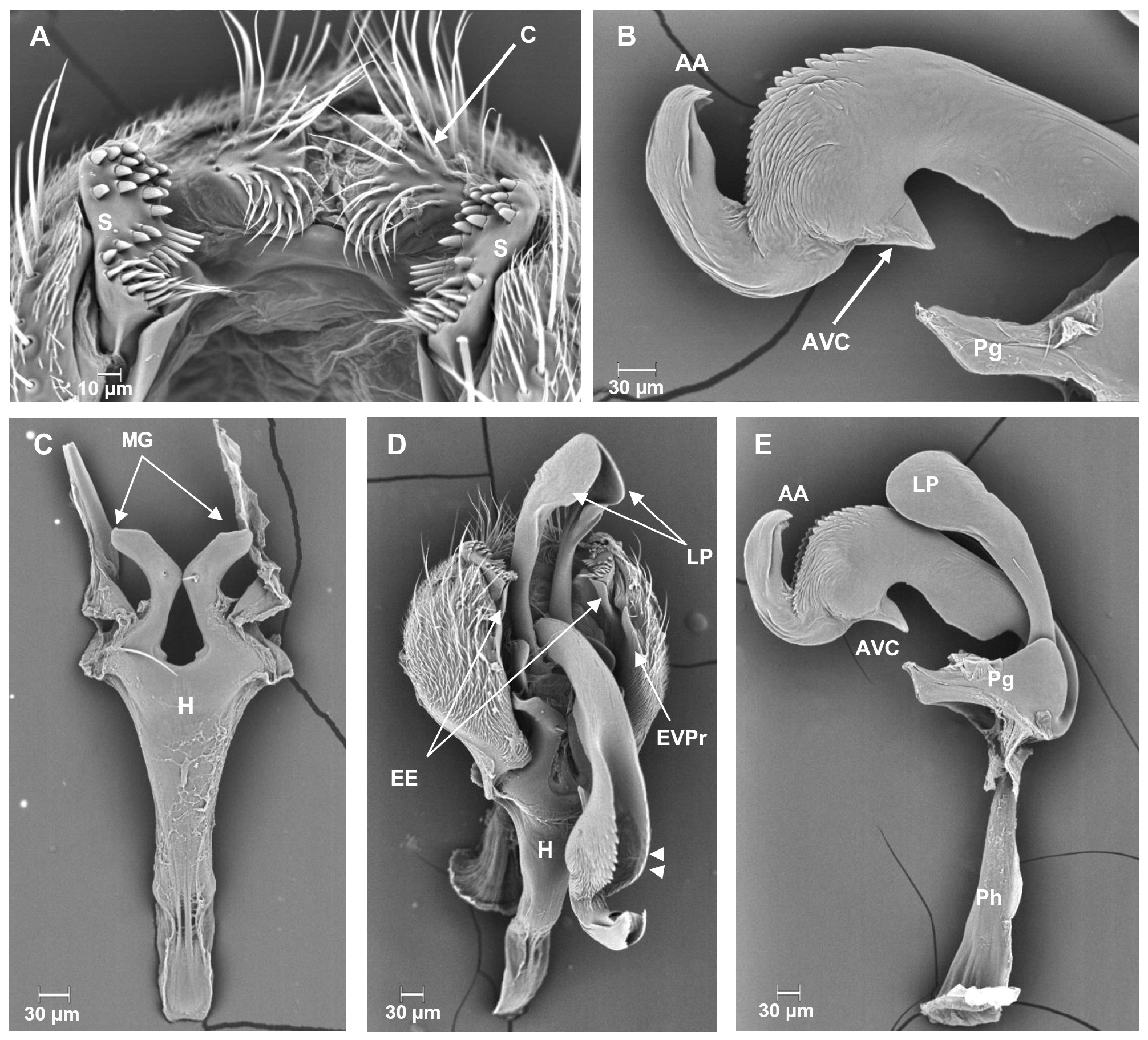 FIGURE 14. Scanning electron micrographs of D. neoelliptica. male terminalia A. Ventral view of surstyli and cercus (1.360 x magnification). (B) Lateral view of aedeagus (707 x magnification). (C) Ventral view of hypandrium (493 x magnification). (D) Ventral view of terminalia. Arrow heads = a cleft on the dorsal region covered with scales (389 x magnification). (E) Lateral view of aedeagus and phallapodeme (377 x magnification). The imagens are from NEO-1 strain. Abbreviations in Table 1.