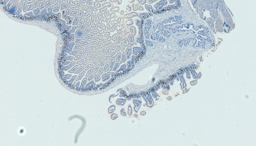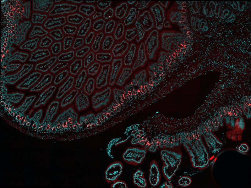 Mouse duodenum fixed in 4% PFA overnight at 4°C, processed for paraffin infiltration using a standard histology procedure and cut at 4 microns were dewaxed, rehydrated, permeabilized with 0.5% Triton X-100 in PBS 1x and stained with Azide - Alexa Fluor 555 (Thermo Fisher) to detect EdU and DAPI for nuclei. The images were taken using a Leica DM5500 microscope with a 40X N.A.1 objective (black&white camera: DFC350FXR2, pixel dimension: 0.161 microns). Next, the slide was unmounted and stained using the fully automated Ventana Discovery xT autostainer (Roche Diagnostics, Rotkreuz, Switzerland). All steps were performed on automate with Ventana solutions. Sections were pretreated with heat using the CC1 solution under mild conditions. The primary rat anti BrDU (clone: BU1/75 (ICR1), Serotec, diluted 1:300) was incubated 1 hour at 37°C. After incubation with a donkey anti rat biotin diluted 1:200 (Jackson ImmunoResearch Laboratories), chromogenic revelation was performed with DabMap kit. The section was counterstained with Harris hematoxylin (J.T. Baker) before a second round of imaging on DM5500 PL Fluotar 40X N.A.1.0 oil (color camera: DFC 320 R2, pixel dimension: 0.1725 microns). Before acquisition, a white-balance as well as a shading correction is performed according to Leica LAS software wizard. The fluorescence and DAB images were converted in ome.tiff multiresolution file with the kheops Fiji Plugin.