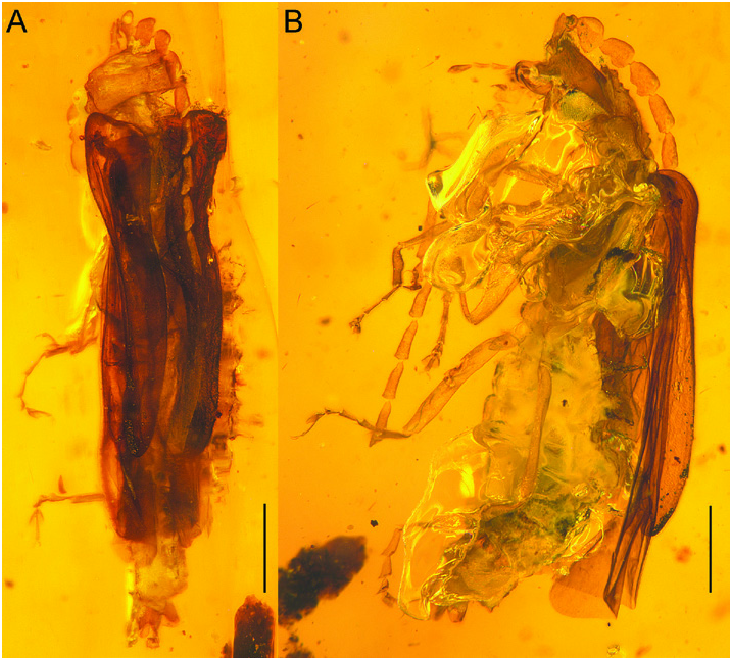 Figure 7. Habitus of Hukawngichthyurus maha: A, dorsal view; B, ventral-lateral view. Scale bars: 0.5 mm.