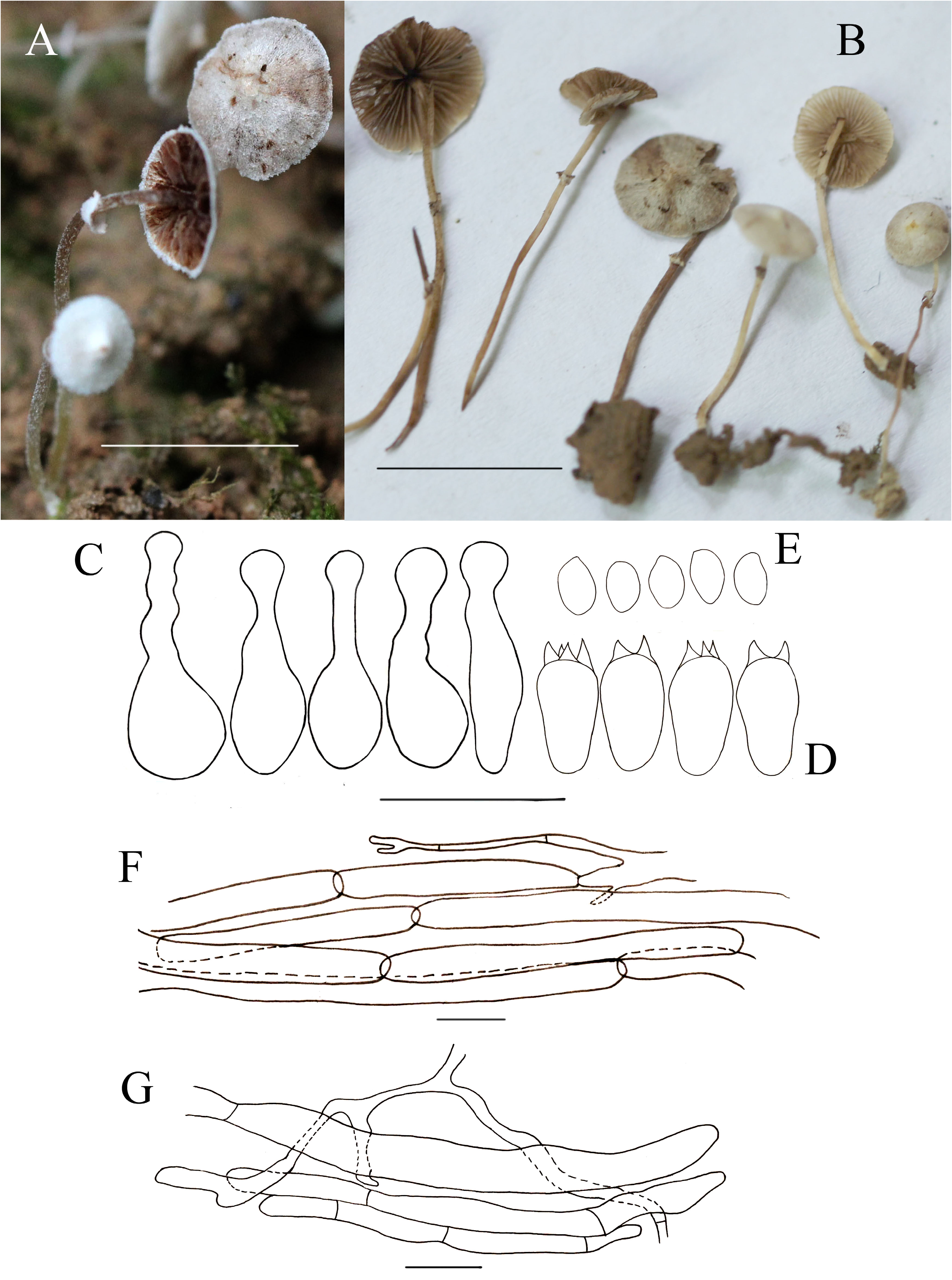 FIGURE 3. Micropsalliota delicatula (HMAS290752, holotype), (A-B) Basidiomata in field (C) Cheilocystidia; (D) Basidia (E) Basidiospores; (F) Annulus hyphae; (G) Pileipellis hyphae; bar A, B = 1 cm; C–G=20μm.
