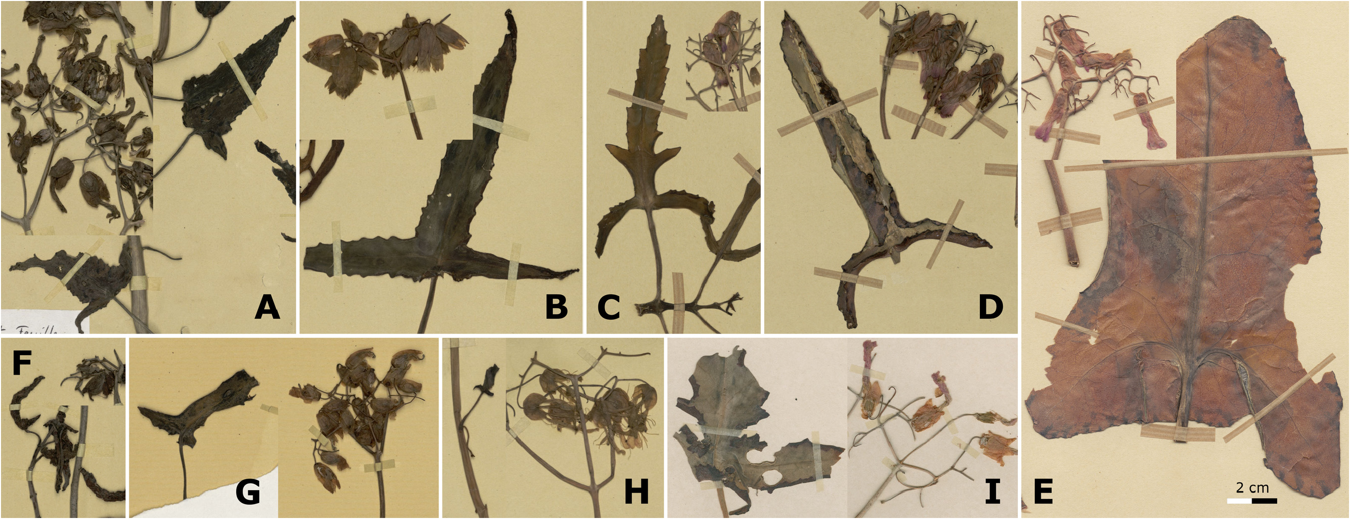 FIGURE 5. Comparison of leaves and flowers (inserts) of selected specimens of Kalanchoe rosei and K. peltigera, all elements to scale. A–B. Two specimens of K. rosei from the Onilahy region: A. P-P00444008 and B. P-P00444018. C–D. Two unusual specimens of K. peltigera from the Tsivory region: C. P-P00444011 and D. P-P00444012. E. Seyrig 819 (P-P00374207), a specimen of K. peltigera. F–G. Two specimens of K. rosei from between Tsivory and Behara: F. P-P00444006 and G. P-P00444003. H. Type of K. bouvieri, an abnormal form of K. rosei. I. Isotype of K. rosei (US00603536). Photographs of material held in the Vascular plants collection, Muséum National d'Histoire Naturelle, Paris (P) (A–H); and United States National Herbarium, Smithsonian Institution (US) (I).
