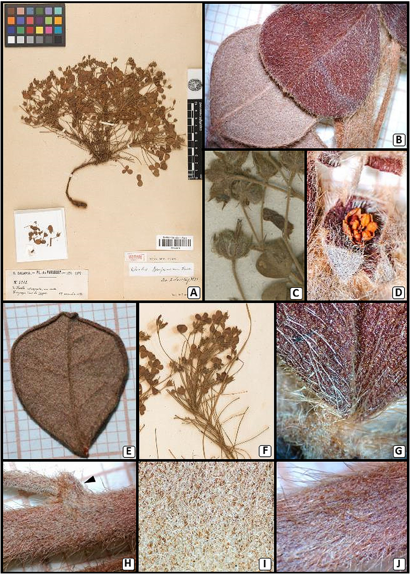 FIGURE 5. Oxalis benjaminii. A—dried specimen; B—leaflets adaxial (top) and abaxial (bottom) surfaces; C—fruits; D—young flower detail; E—leaflet abaxial surface, showing revolute margin; F—branch detail; G—adaxial detail of leaflet insertion; H—leaf insertion at stem, showing stipule (arrowhead); I—leaflet abaxial surface indumentum; J—stem indumentum detail. Photos: A. Nuernberg-Silva (A, C, F from B.Balansa 2242, P02440124; B, D–E, G–J from G.C.Marmoni 1611, CTES).