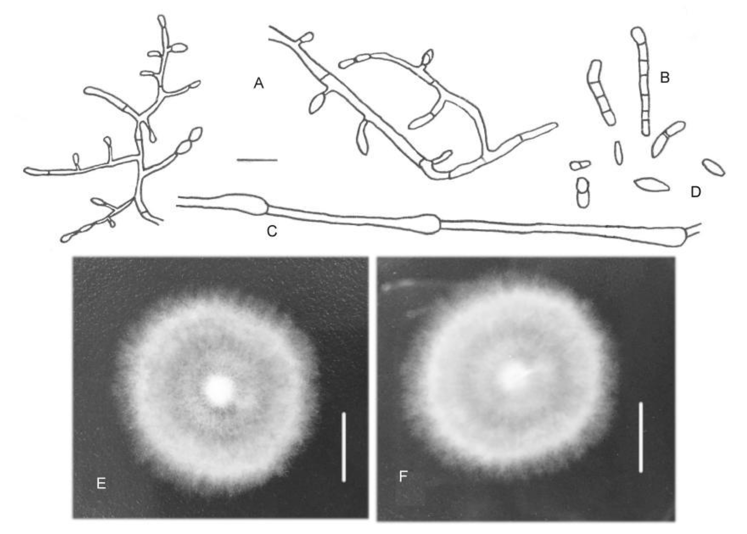 FIGURE. Chrysosporium sichuanense (holotype). A. Conidiogenous structures. B. Arthroconidia. C. Racquet hyphae. D. Conidia. E–F. Colony (front and reverse) on PDA. Bars: A–D = 20 μm, E–F = 10 mm.