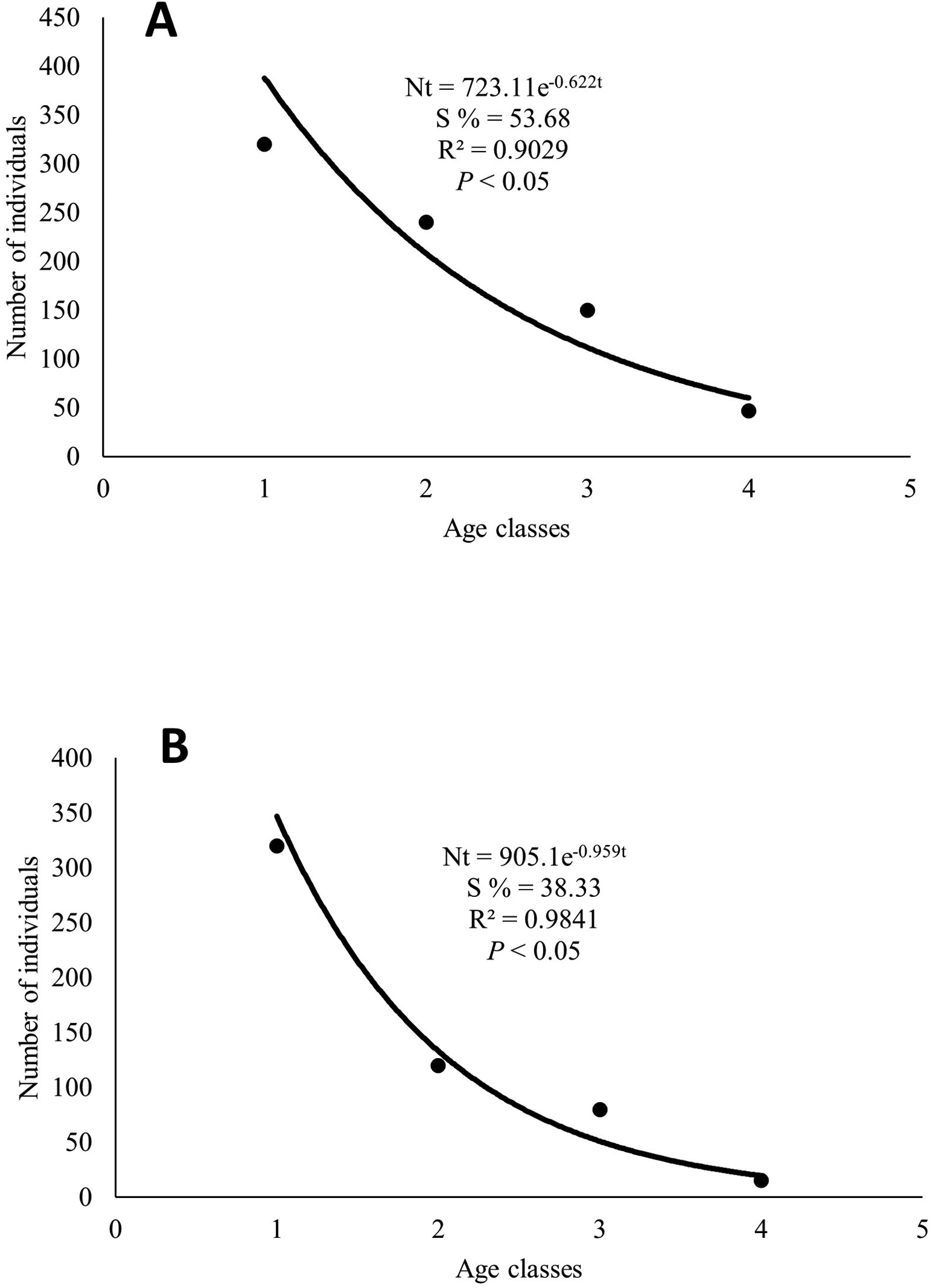 Figure 5. Mortality of Caribitroides (Caribitroides) tuxtlensis Lindeman, 1990. Relationship between age classes and the number of individuals in the Sierra de Santa Martha, Los Tuxtlas, Veracruz. A, females; B, males.
