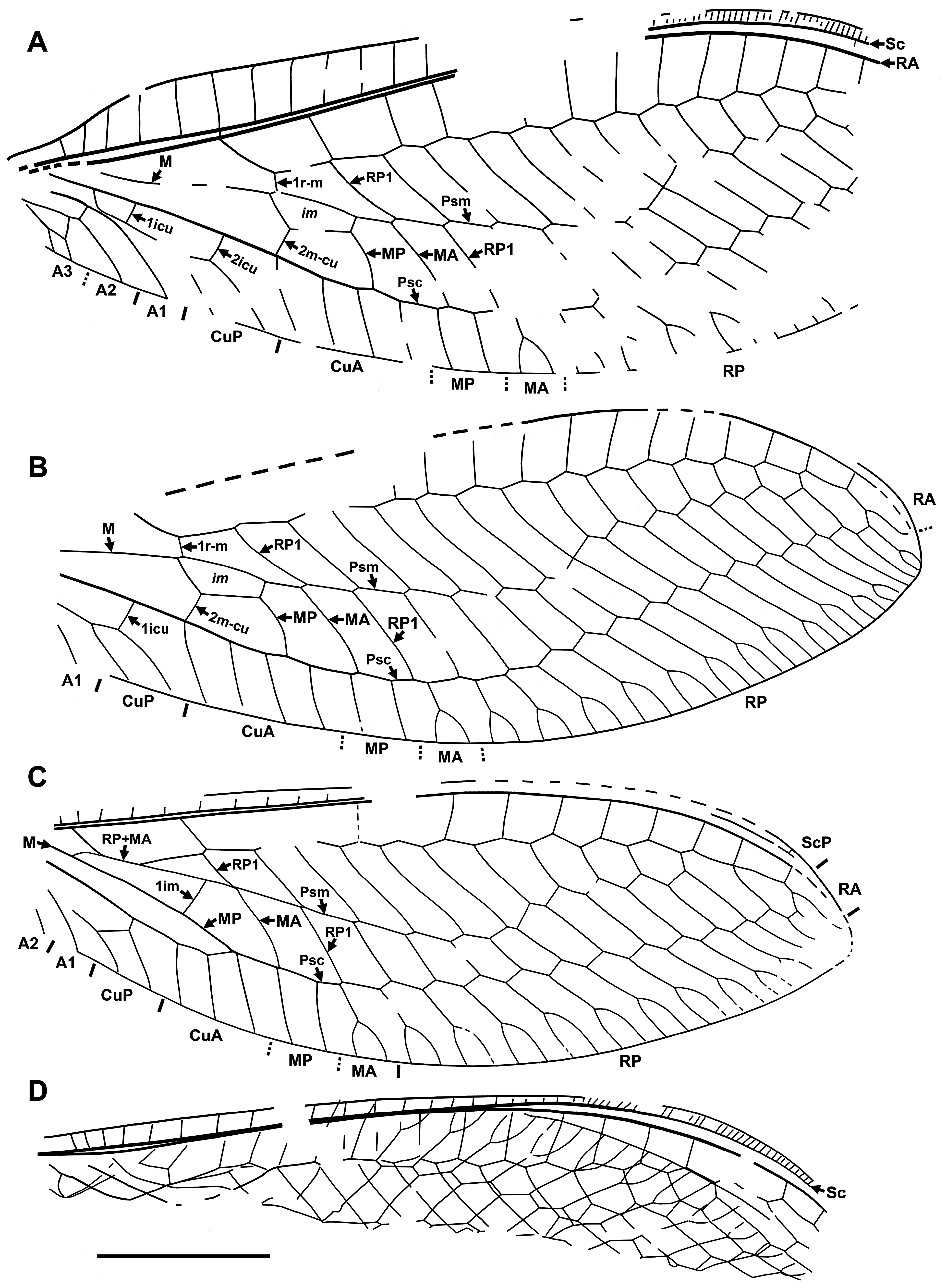 FIGURE 11. Wing venation drawings of Cimbrochrysa major sp. nov., holotype FLFO 9819 (female). A, left forewing; B, right forewing; C, right hind wings; D, left hind wing. Scale bar = 3 mm (all to scale).