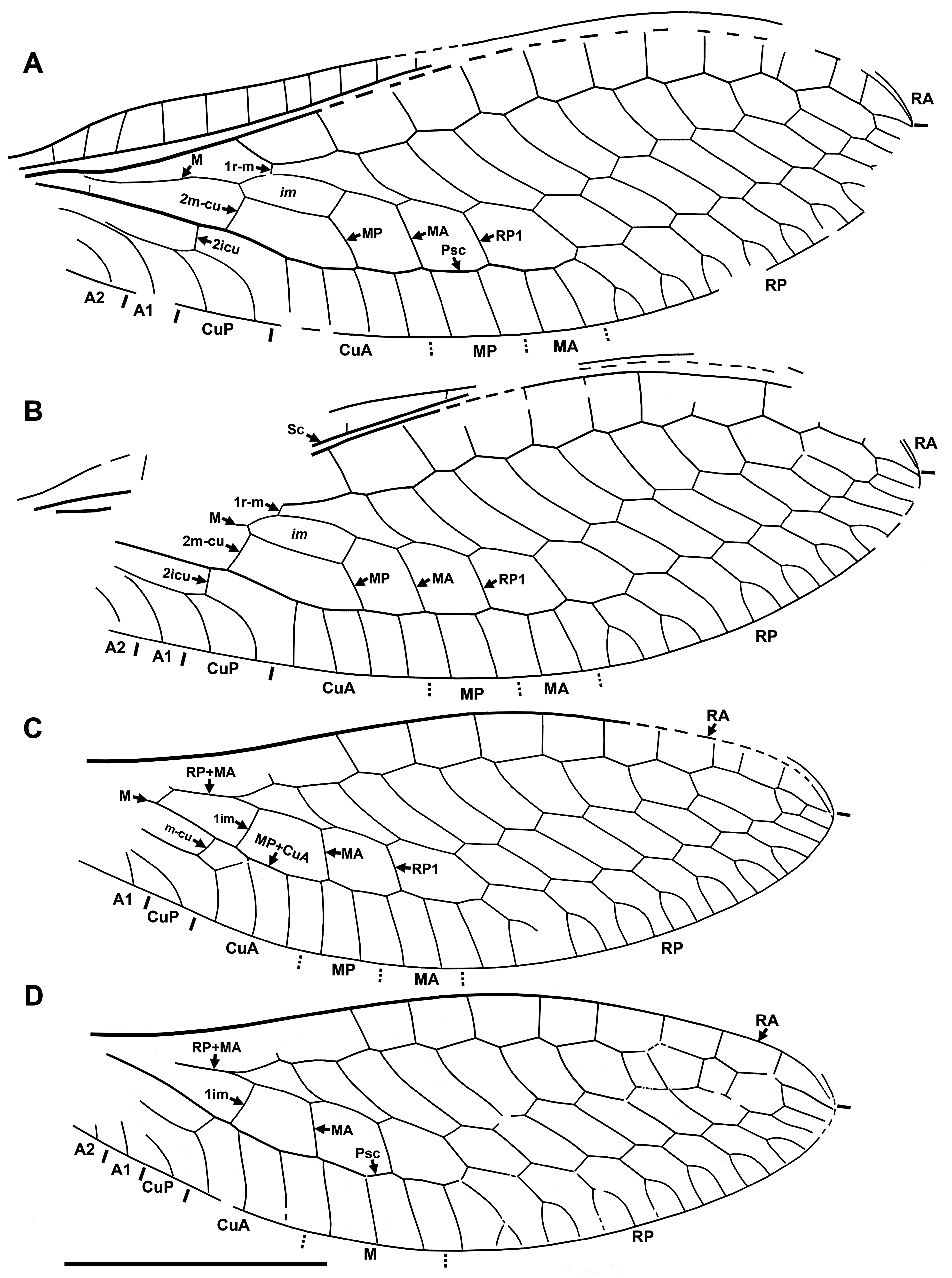 FIGURE 19. Wing venation of Lithochrysa ferruginea (Cockerell, 1909), specimen FLFO 9745. A, left forewings; B, right forewing; C, right hind wings; D, left hind wing. Scale bar = 3 mm (all to scale).