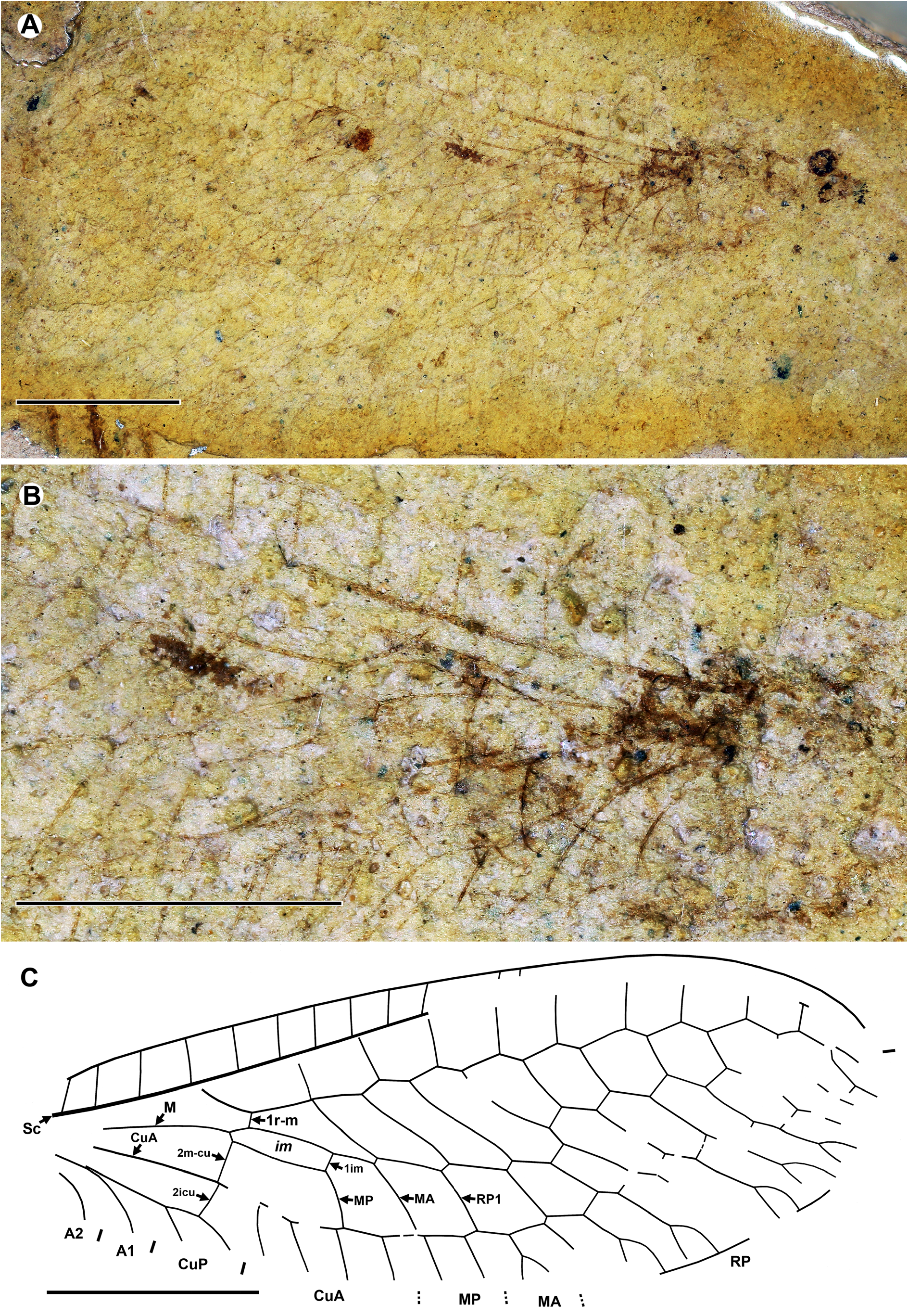 FIGURE 23. Tribochrysa inaequalis Scudder, 1885, holotype MCZ 243. A, photograph; B, proximal part of left wings; C, venation drawing of left forewing (converted to standard view, with apex to the right). Scale bars = 3 mm.
