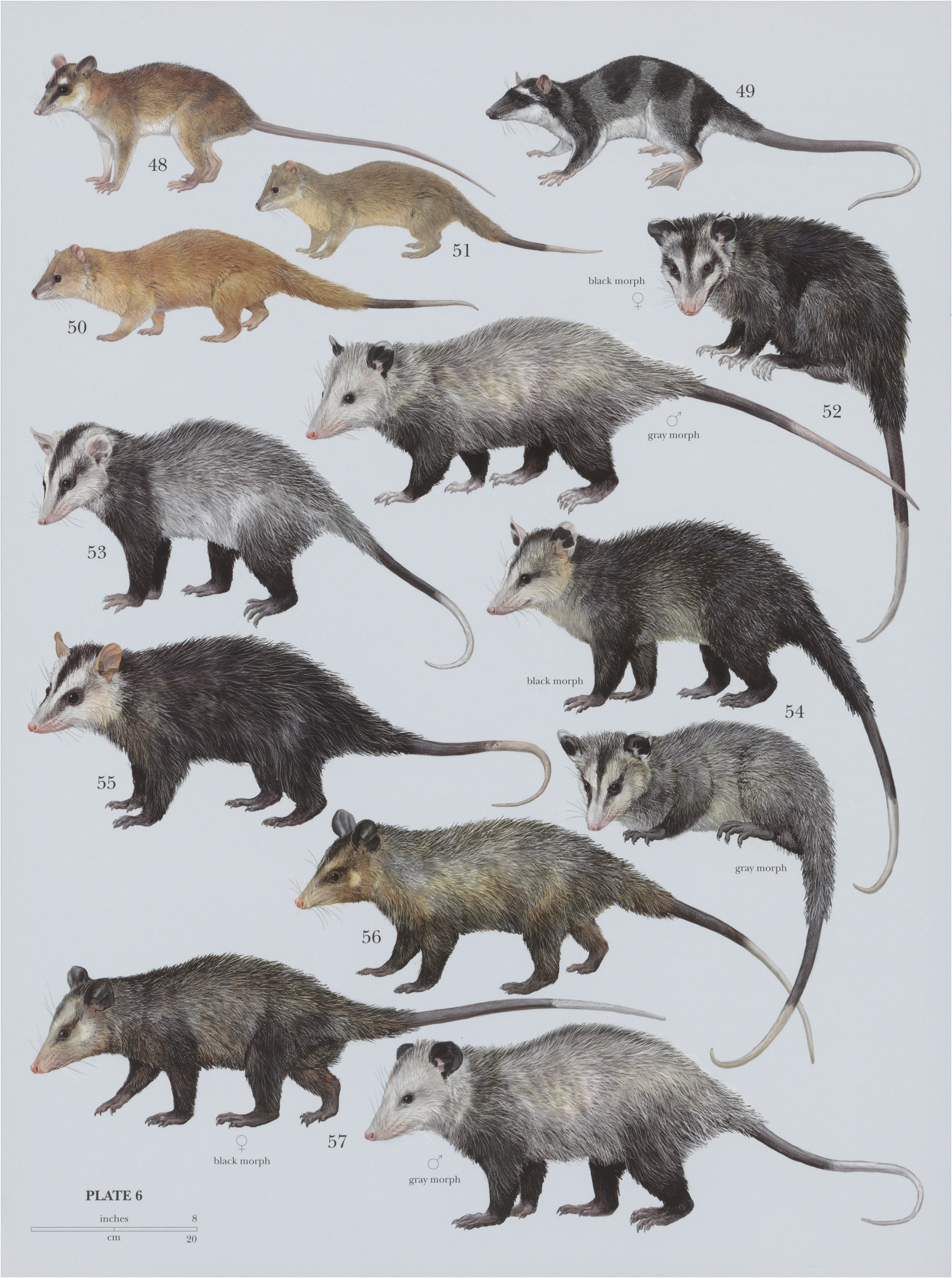 On following pages: 50. Big Lutrine Opossum (Lutreolina crassicaudata); 51. Massoia's Lutrine Opossum (Lutreolina massoia); 52. Virginia Opossum (Didelphis virginiana), 53. Brazilian White-eared Opossum (Didelphis albiventris); 54. Guianan White-eared Opossum (Didelphis imperfecta); 55. Andean White-eared Opossum (Didelphis pernigra); 56. Southern Black-eared Opossum (Didelphis aurita); 57. Northern Black-eared Opossum (Didelphis marsupialis).