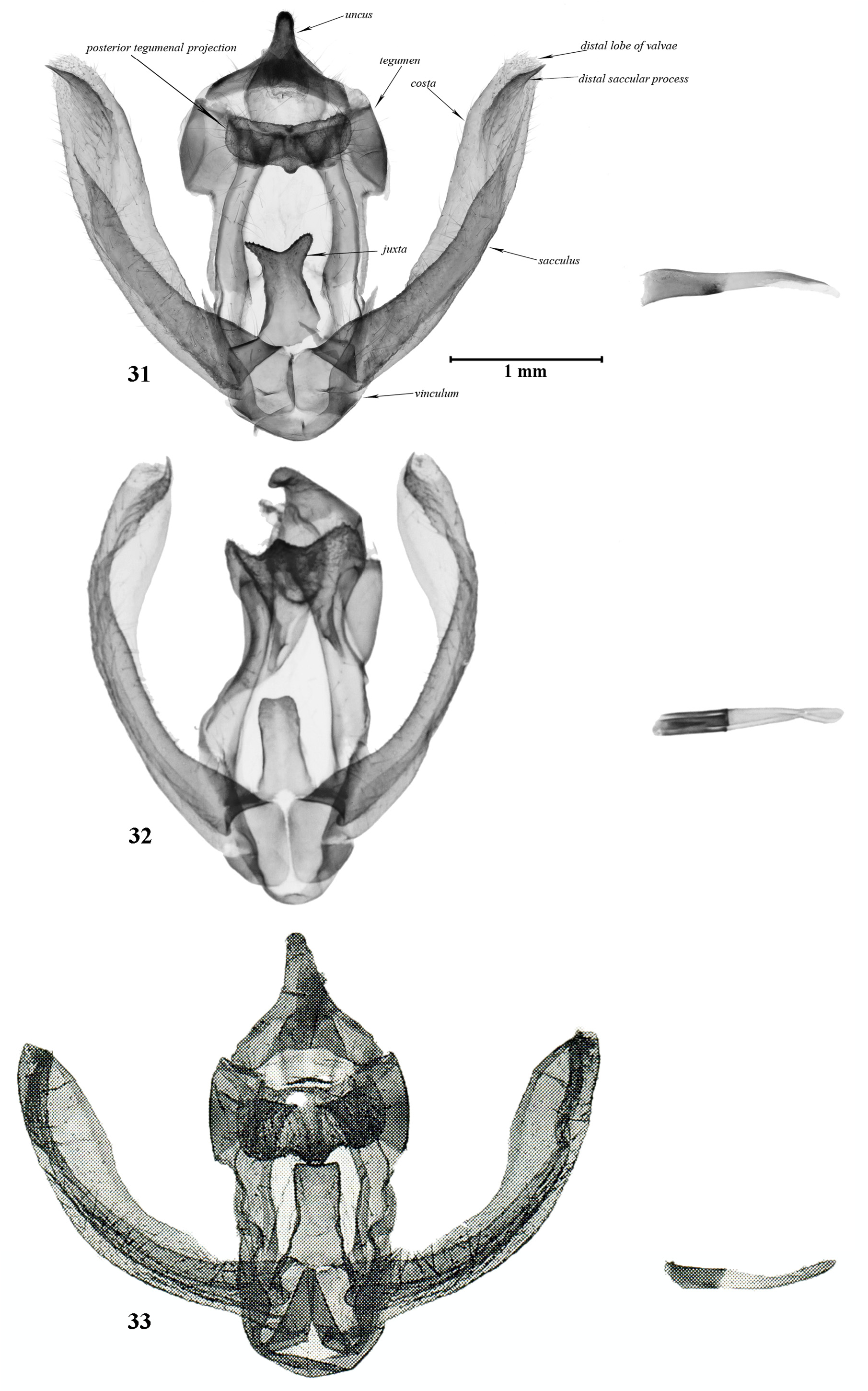 FIGURES 31–33. Male genitalia of Agalope spp. 31, Agalope haoi sp. n., HT, slide ZSY220; 32, A. wangi, by courtesy of Dr. Shipher Wu; 33, A. wangi, HT, slide NSMT2166m#, after Owada (1992). Scale bar for fig. 31.