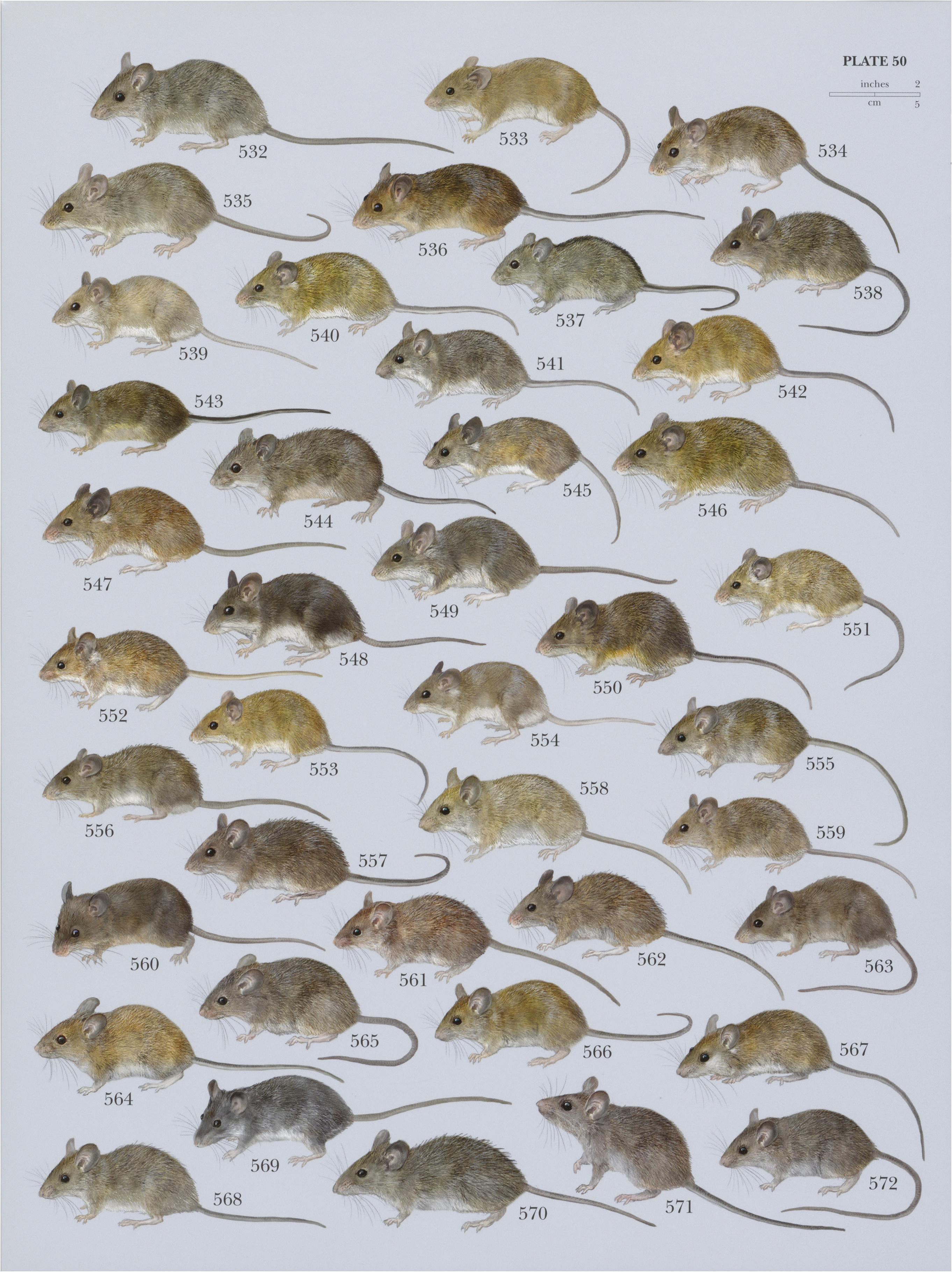 On following pages: 534. Macedonian Mouse (Mus macedonicus); 535. Mound-building Mouse (Mus spicilegus); 536. Cypriot Mouse (Mus cypriacus); 537. Ethiopian Striped Mouse (Mus imberbis); 538. Mahomet Mouse (Mus mahomet): 539. Hausa Mouse (Mus haussa); 540. West African Pygmy Mouse (Mus musculoides); 541. Baoule Mouse (Mus baoulei); 542. Matthey's Mouse (Mus mattheyi); 543. Toad Mouse (Mus bufo); 544. Callewaert's Mouse (Mus callewaerti); 545. Gounda Mouse (Mus goundae); 546. Neave's Mouse (Mus neavel); 547. Ubangui Mouse (Mus oubanguii); 548. Peters's Mouse (Mus setulosus); 549. Thomas's Mouse (Mus sorella): 550. Gray-bellied Mouse (Mustriton); 551. Delicate Mouse (Mus tenellus); 552. Desert Pygmy Mouse (Mus indutus); 553. Sub-Saharan Pygmy Mouse (Mus minutoides); 554. Setzer's Mouse (Mus setzeri); 555. Little Indian Field Mouse (Mus booduga); 556. Phillips's Mouse (Mus phillipsi); 557. Flat-haired Mouse (Mus platythrix); 558. Saxicolous Mouse (Mus saxicola); 559. Earth-colored Mouse (Mus terricolon); 560. Servant Mouse (Mus famulus): 561. Ceylon Spiny Mouse (Mus fernandoni); 562. Mayor's Mouse (Mus mayori); 563. Ryukyu Mouse (Mus caroli); 564. Fawn-colored Mouse (Mus cervicolor); 565. Cook's Mouse (Mus cookii); 566. Sheath-tailed Mouse (Mus fragilicauda); 567. Little Burmese Field Mouse (Mus lepidoides); 568. Blyth's Mouse (Mus nitidulus); 569. Indochinese Shrew-like Mouse (Mus pahari); 570. Shortridge's Mouse (Mus shortridgei); 571. Sumatran Shrew-like Mouse (Mus crociduroides); 572. Javan Shrew-like Mouse (Mus vulcani).