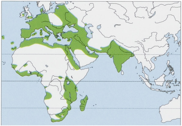 Distribution. Originally native to the Indian Subcontinent and now introduced worldwide, including the sub-Antarctic Macquarie I but not Antarctica (modern introductions not shaded on the map).