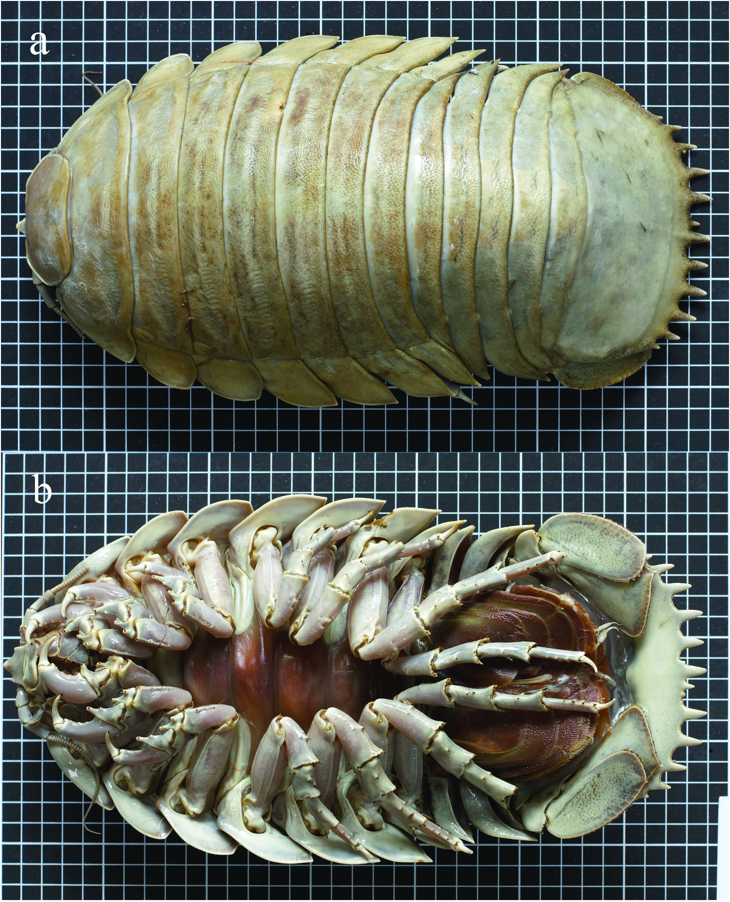 Figure 8. Bathynomus jamesi (voucher no. TMCD003328), body length 321 mm. (a) Dorsal view; (b) ventral view. Each square is 10 mm on a side.