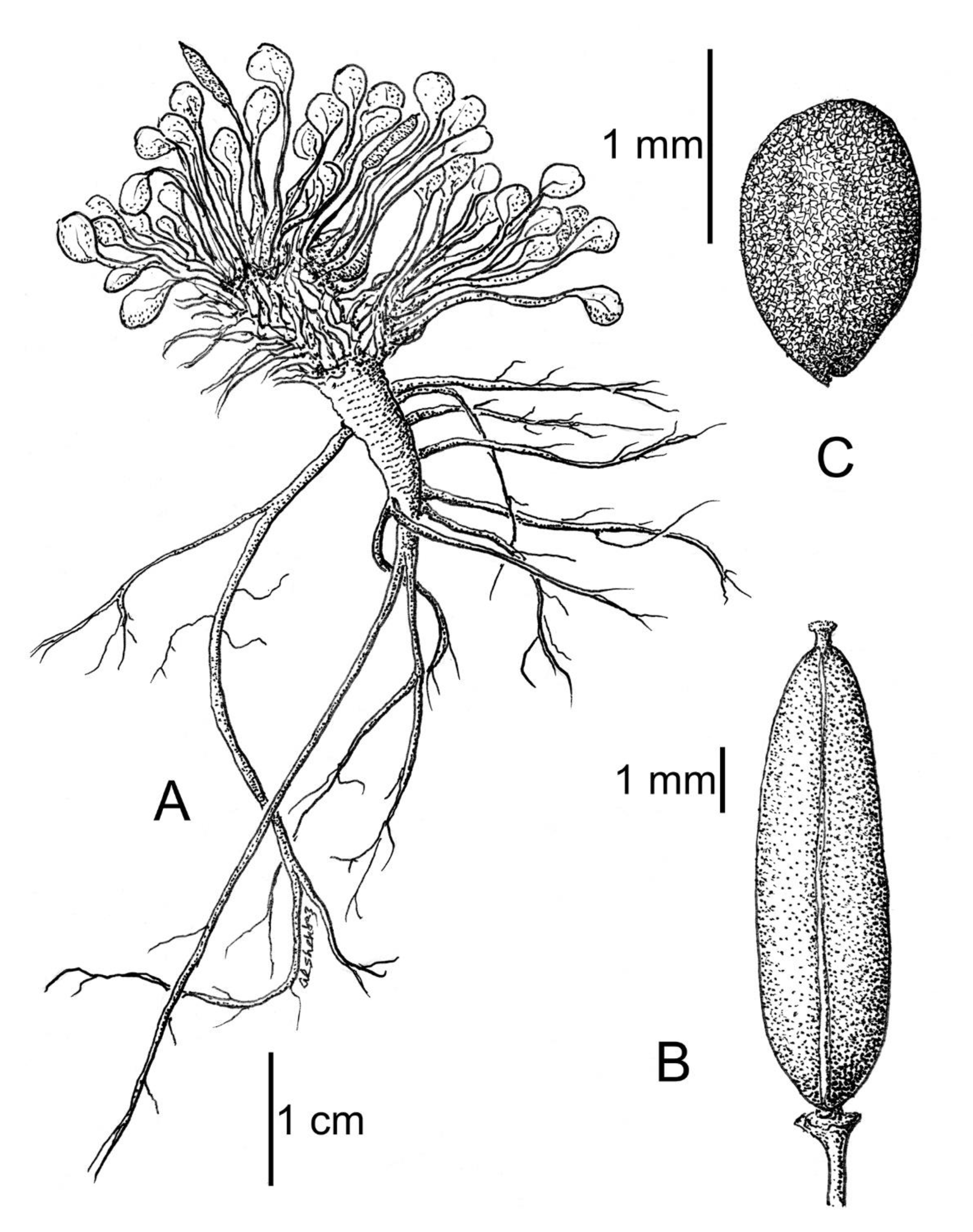 FIGURE 1. Brayopsis arequipa. A. Plant. B. Fruit. C. Seed. Drawn by Al-Shehbaz from isotype (Cueva & Oblitas 1963, MO-6701109).