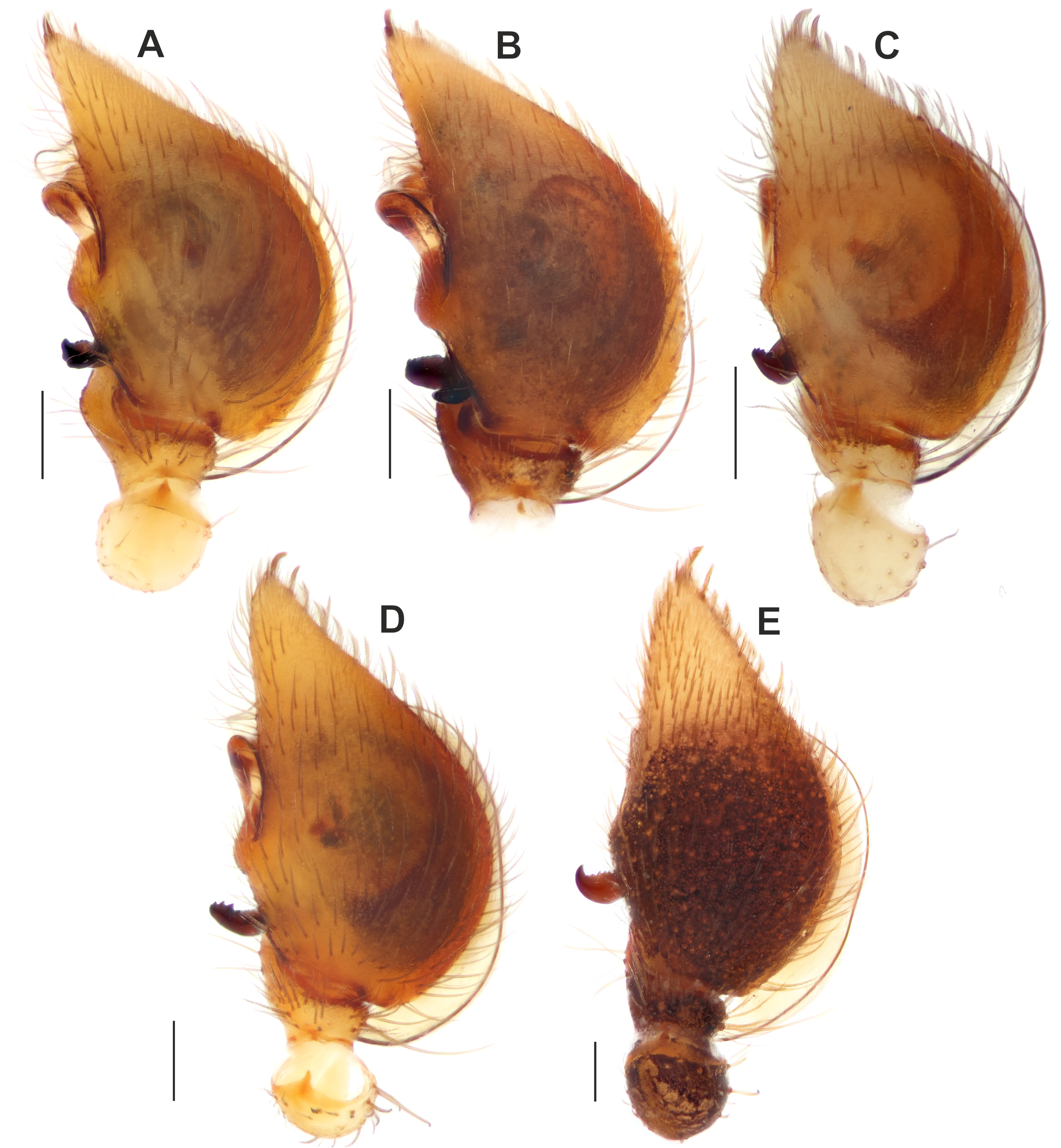 FIGURE 6. Male palps of Zodariellum asiaticum (A), Z. bactrianum (B), Z. nenilini (C), Z. turanicum sp. n. (D) and Z. turkmenicum sp. n. (E), dorsal view. Scale bars = 0.2 mm.