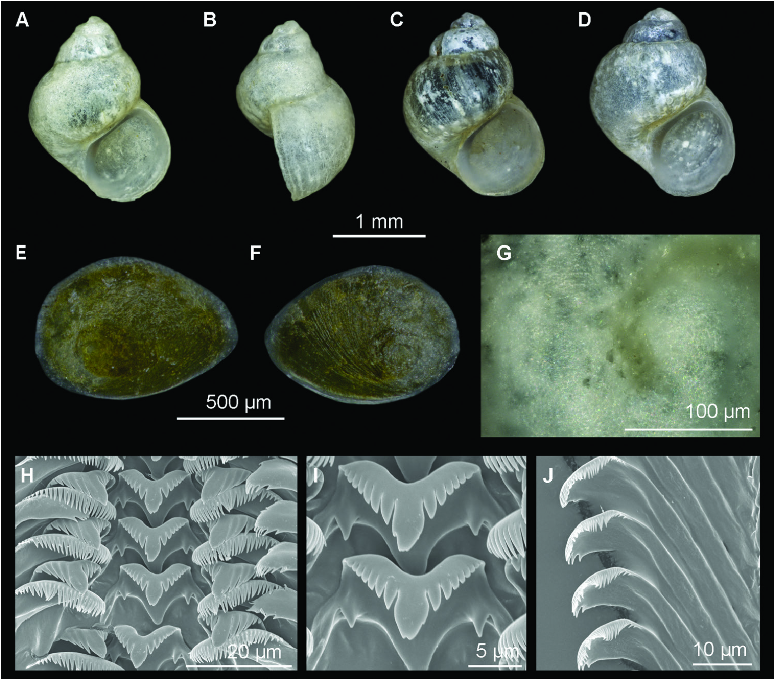 Figure 18. Shells, operculum and radulae of Radomaniola pesici sp. nov. A, B, holotype (MNCN 15.05/200163). C–J, paratypes (UGSB 19048). C, D, shells. E, F, operculum (E, inner side; F, outer side). G, protoconch. H, portion of radula ribbon. I, central radular teeth. J, outer marginal teeth.
