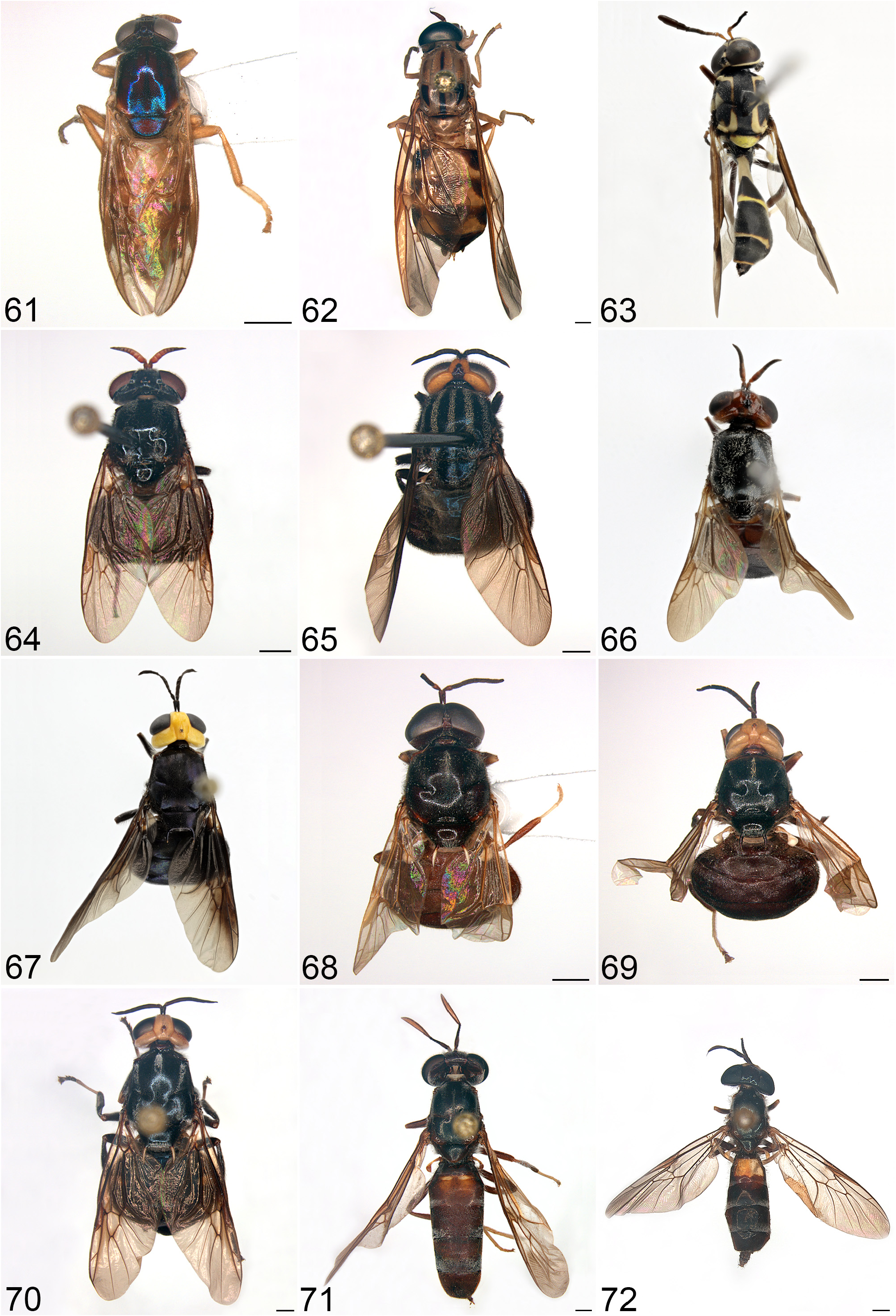 FIGURES 61–72. Stratiomyid species, habitus dorsal. 61 in An illustrated checklist of Stratiomyidae (Diptera: Brachycera) from Paraguay with three new synonyms and 22 new records of species for the country