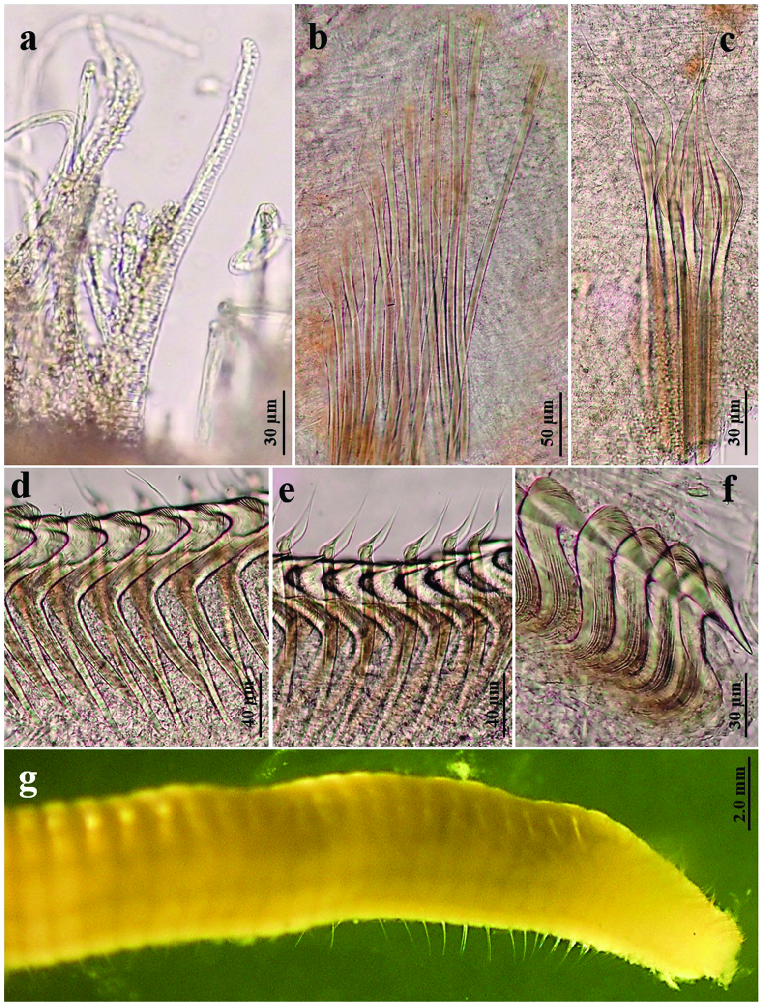 Figure 4. Acromegalomma quadrioculatum (Willey, 1905). (a) Radiolar tip; (b) thoracic notopodial fascicle with superior group of elongate, narrowly hooded chaetae, and inferior group of Type B chaetae (with progressively tapering distal tip); (c) abdominal fascicle with elongate narrowly hooded chaetae; (d) thoracic uncini; (e) thoracic companion chaetae; (f) abdominal uncini; (g) posterior end of abdomen, latero-ventral view.