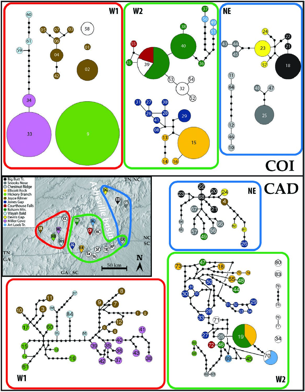 Fig. 5. Individual haplotype/allele networks based on all DASYCerUS individuals, for COI (top half) and CAD alleles (bottom half). Northeastern (NE) and western (W1 and W2) clades as discussed in the text are outlined. Allele/haplotype numbers for each gene match those in Fig. 3 (CAD) and 4 (COI) trees, respectively. Circle and pie-chart colors indicate localities of origin (see map inset). Circle and pie-chart sizes are proportional to number of individuals with that allele/ haplotype in each population. Small black circles indicate mutations.
