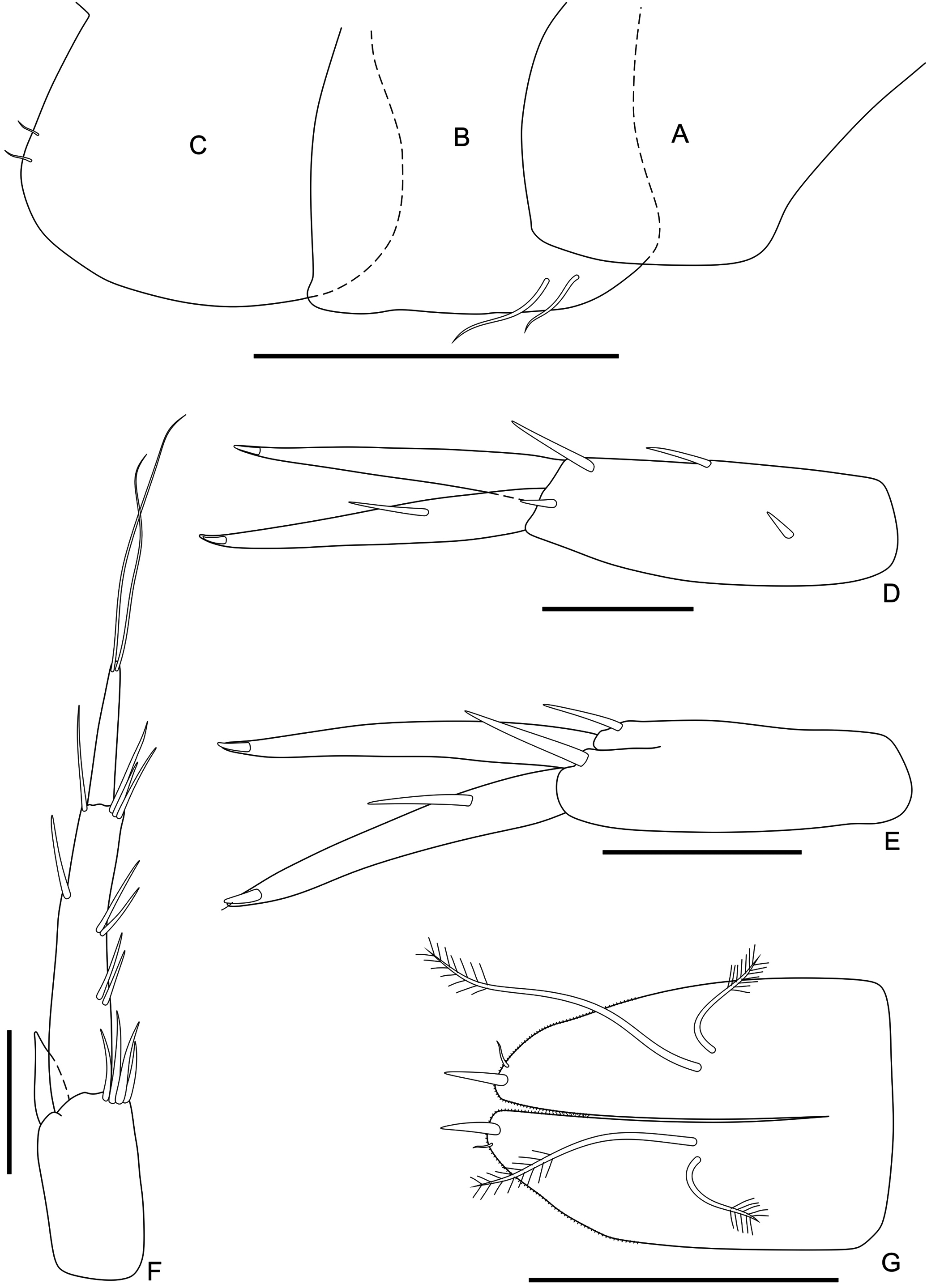 Figure 5. Leptophoxoides longisetae sp. nov., female holotype (MOUFPE 20039). (A) Epimeral plate 1. (B) Epimeral plate 2. (C) Epimeral plate 3. (D) Uropod 1. (E) Uropod 2. (F) Uropod 3. (G) Telson. Scale bars: A-C = 0.3 mm; D-G = 0.1 mm.