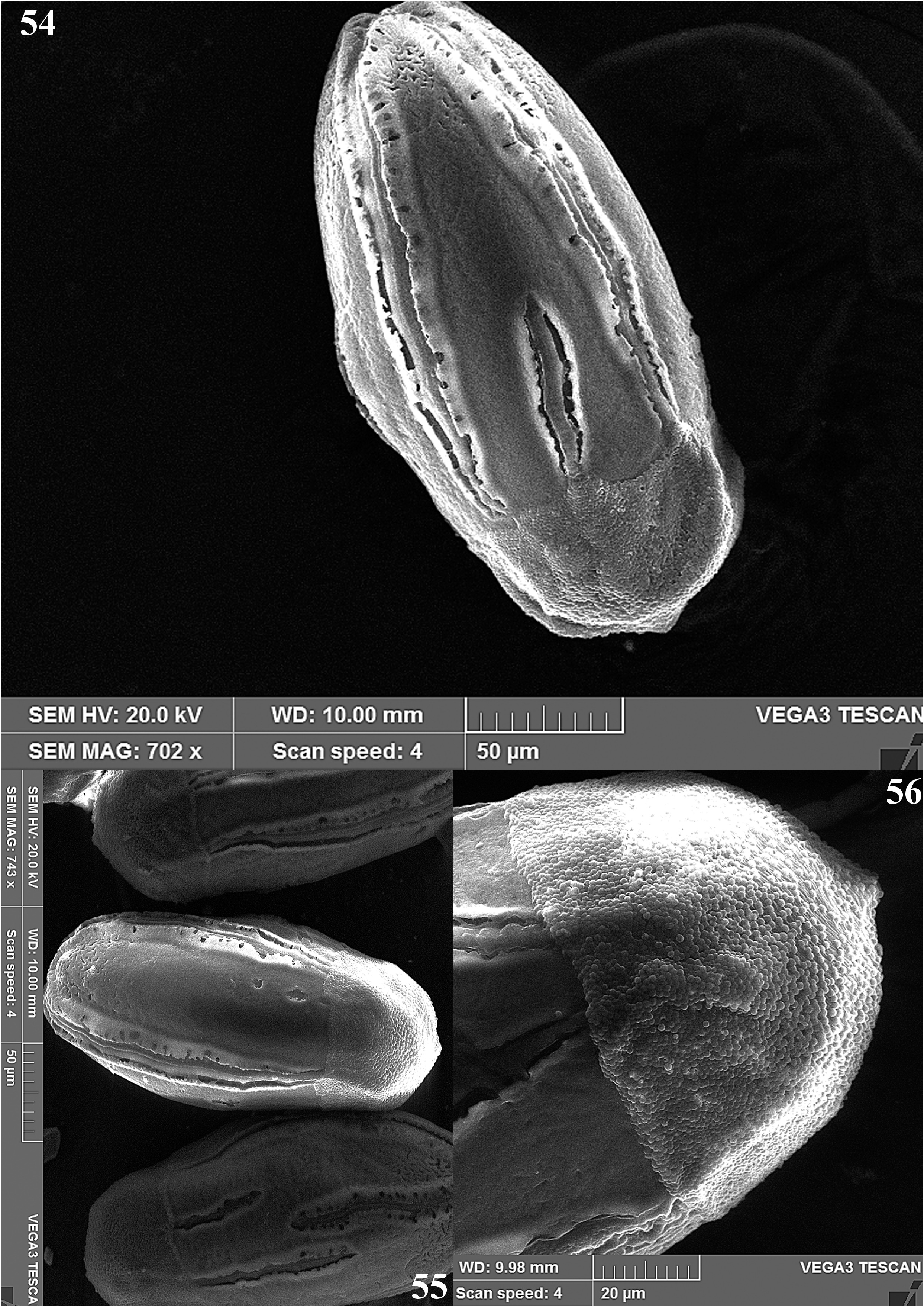 FIGURES 54–56. Tricorythus meenakshi sp. n., SEM view of eggs.