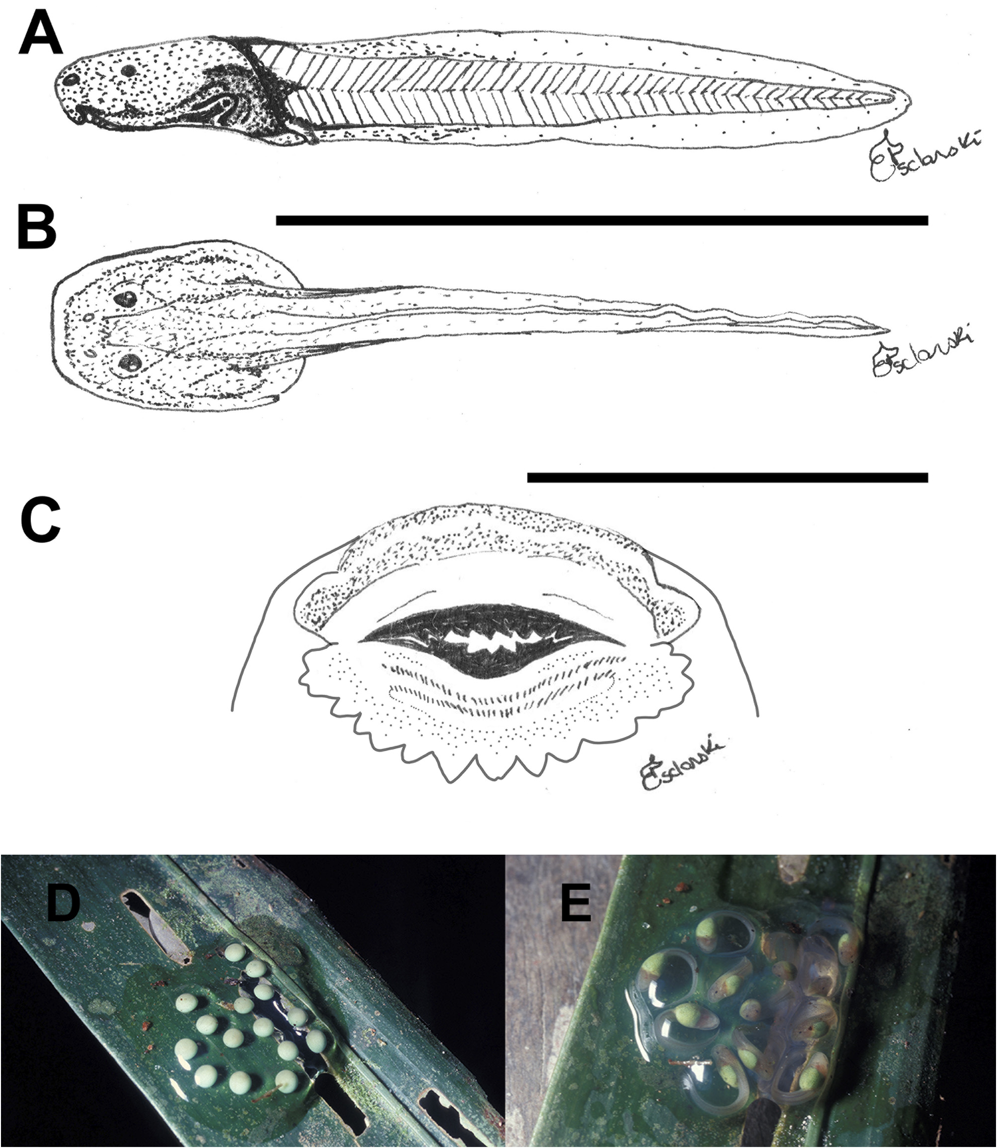 FIGURE 12. Tadpole of Vitreorana ritae (INPA-H 1592) at Stage 25: (A) lateral view, (B) dorsal view (scale = 10 mm), and (C) oral disc (scale = 1 mm). (D) Eggs and (E) embryos.