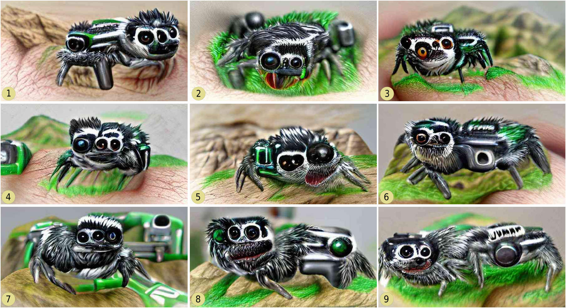 Figure 2. Responses to the jumping spider, high detail text prompt by the Pixray vqgan engine (Table 1: #1). Although primitive, elements of the salticid archetype shown in Figure 1.1, including a horizontal row of eyes, a clypeus, and a fringe above the eyes, can be seen here.
