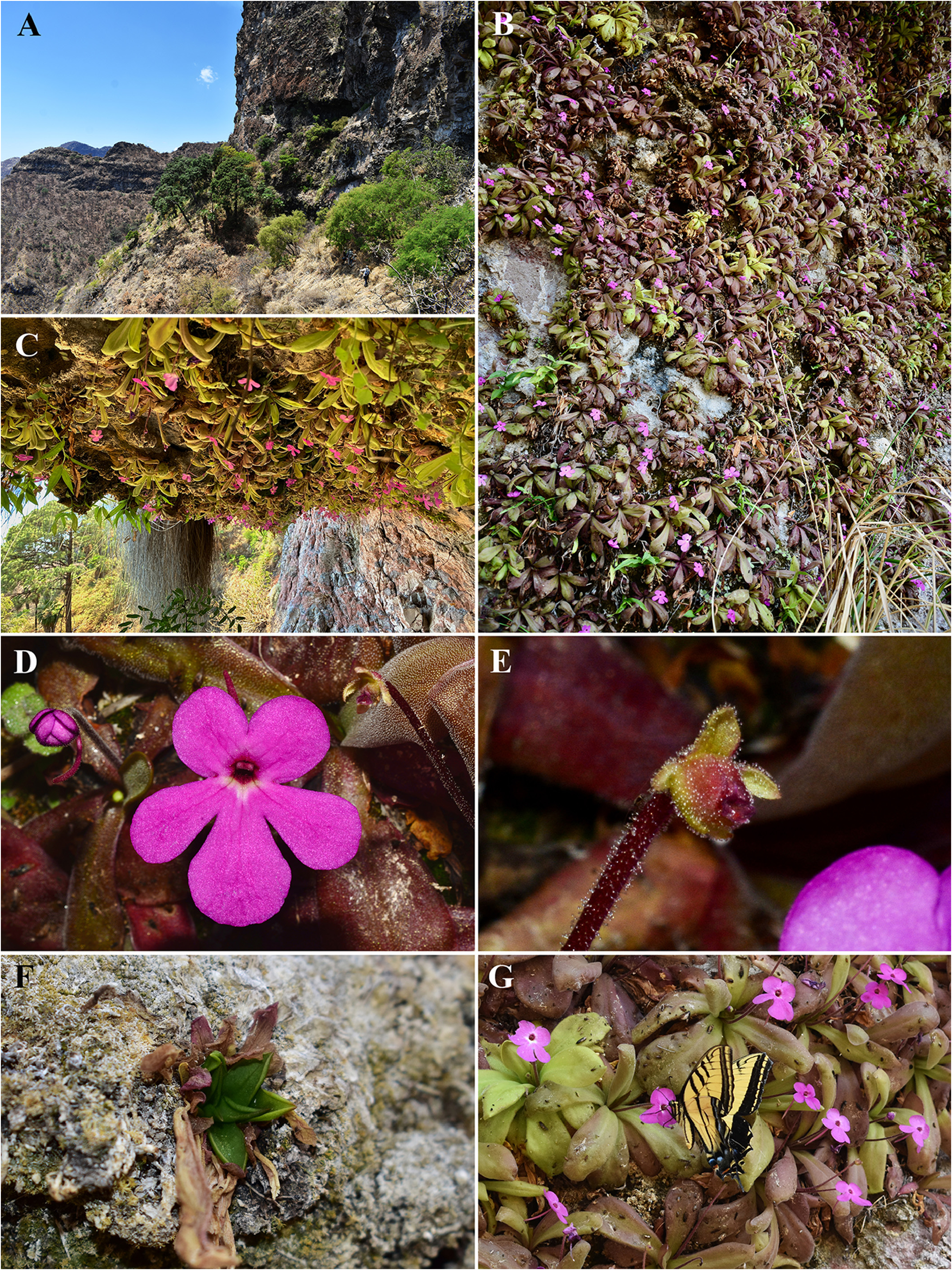 FIGURE 2. Pinguicula warijia. A. Habitat overview. B. Plants growing on igneous rocks on a ca. 30° slope. C. Plants growing upside down on the ceiling of a small cave. D. Detail of the flower. E. Capsule. F. Plant growing in a dry area with reduced leaves. G. A two-tailed swallowtail (Papilio multicaudata) butterfly pollinating a P. warijia flower. Photos A, F and G by Julián Hernández-Rendón; B, C, D and E by Martín Mata-Rosas.