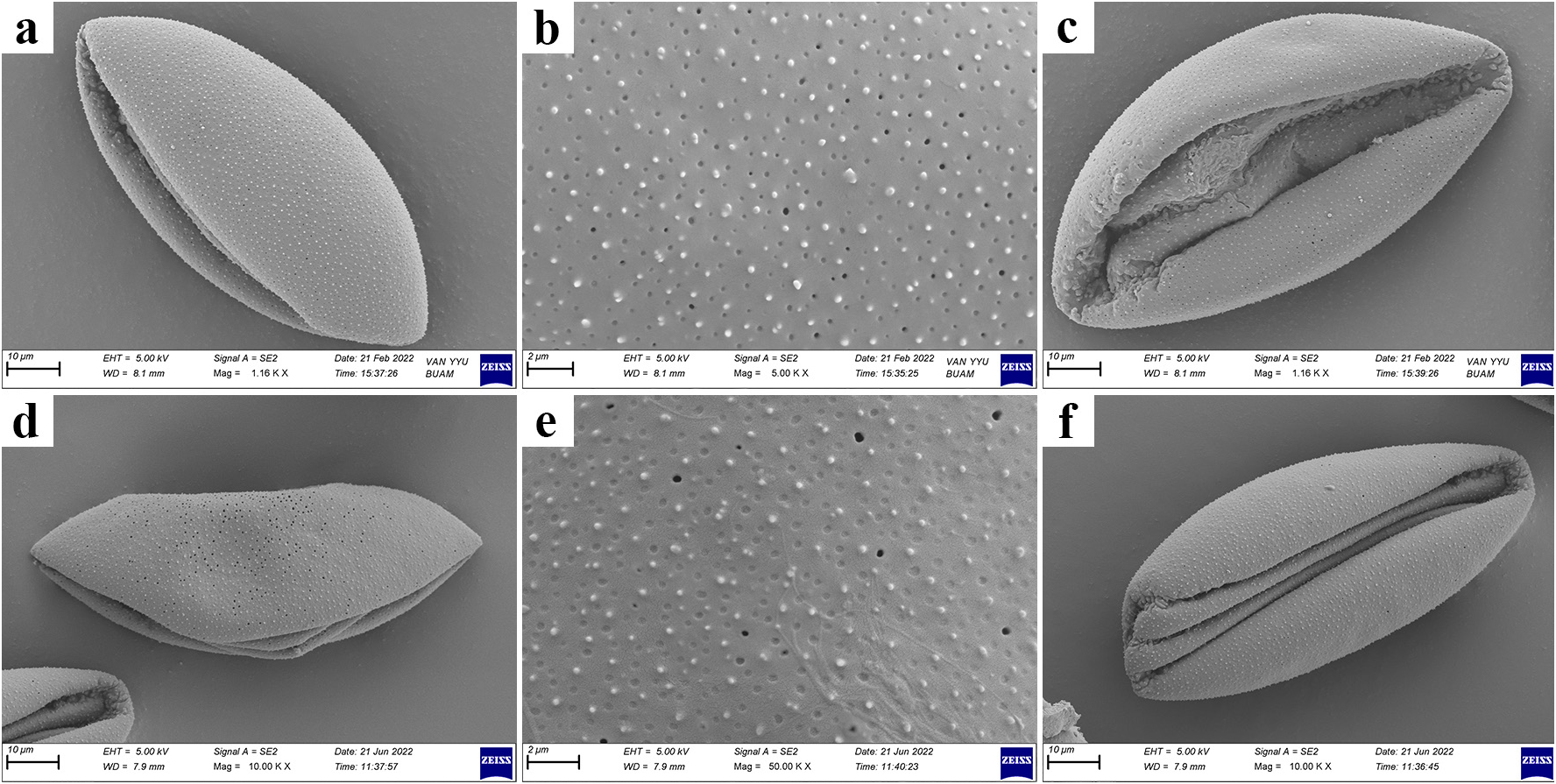 FIGURE 3. SEM photographs of pollen grains of Gladiolus siirtensis and G. humilis; a–c: G. siirtensis, d–f: G. humilis (a–d: equatorial view, b–e: ornamentation in equatorial view, c–f: polar-distal view).