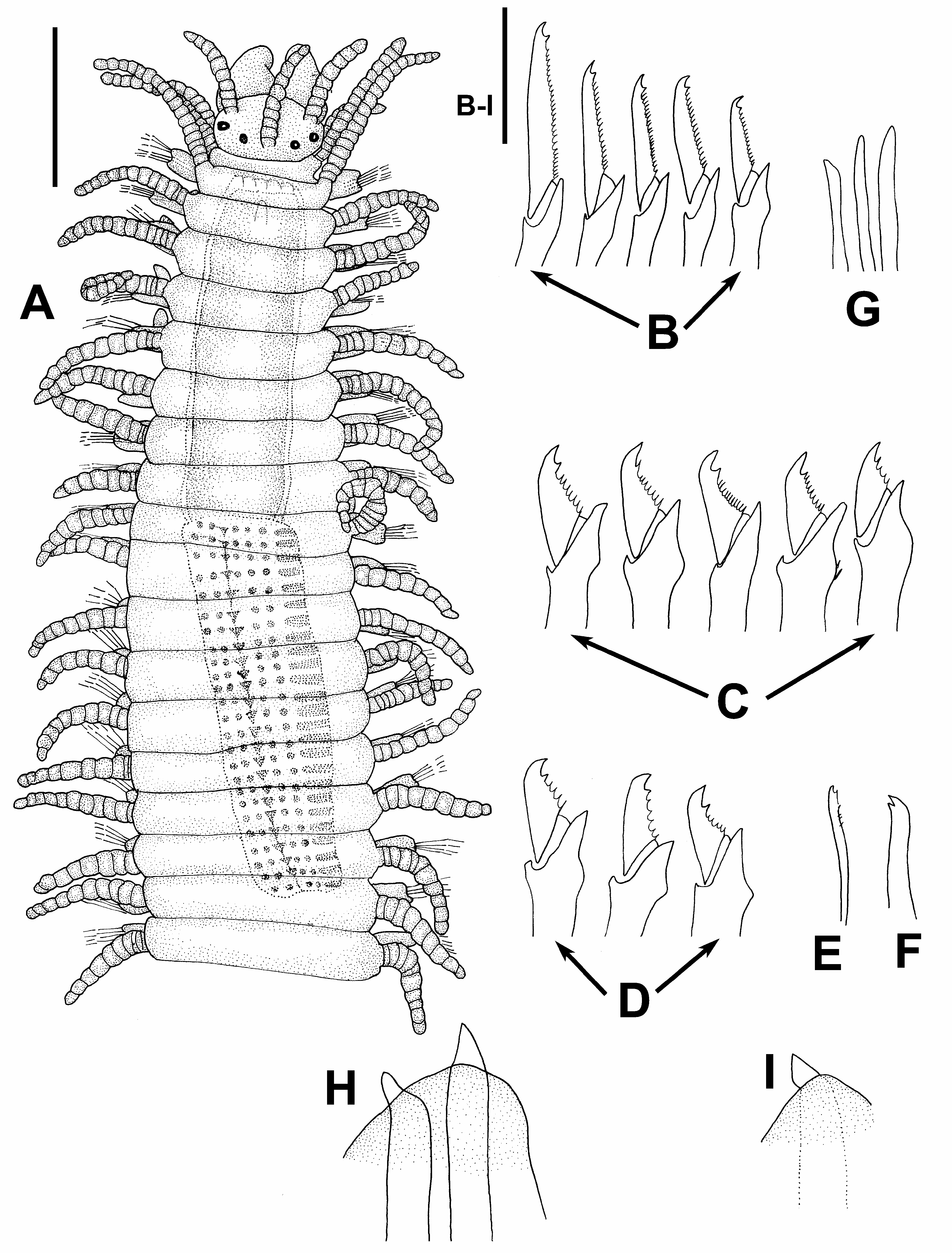 FIGURE 5. Syllis hyalina Grube, 1863. AM W.53905. A, anterior end, dorsal view. B, falcigers, anterior parapodium. C, falcigers, midbody parapodium. D, falcigers, posterior parapodium. E, dorsal simple chaeta. F, ventral simple chaeta. G, aciculae, anterior parapodium. H, aciculae, midbody parapodium. I, acicula, posterior parapodium. Scale. A: 0.2 mm. B–I: 20 µm.