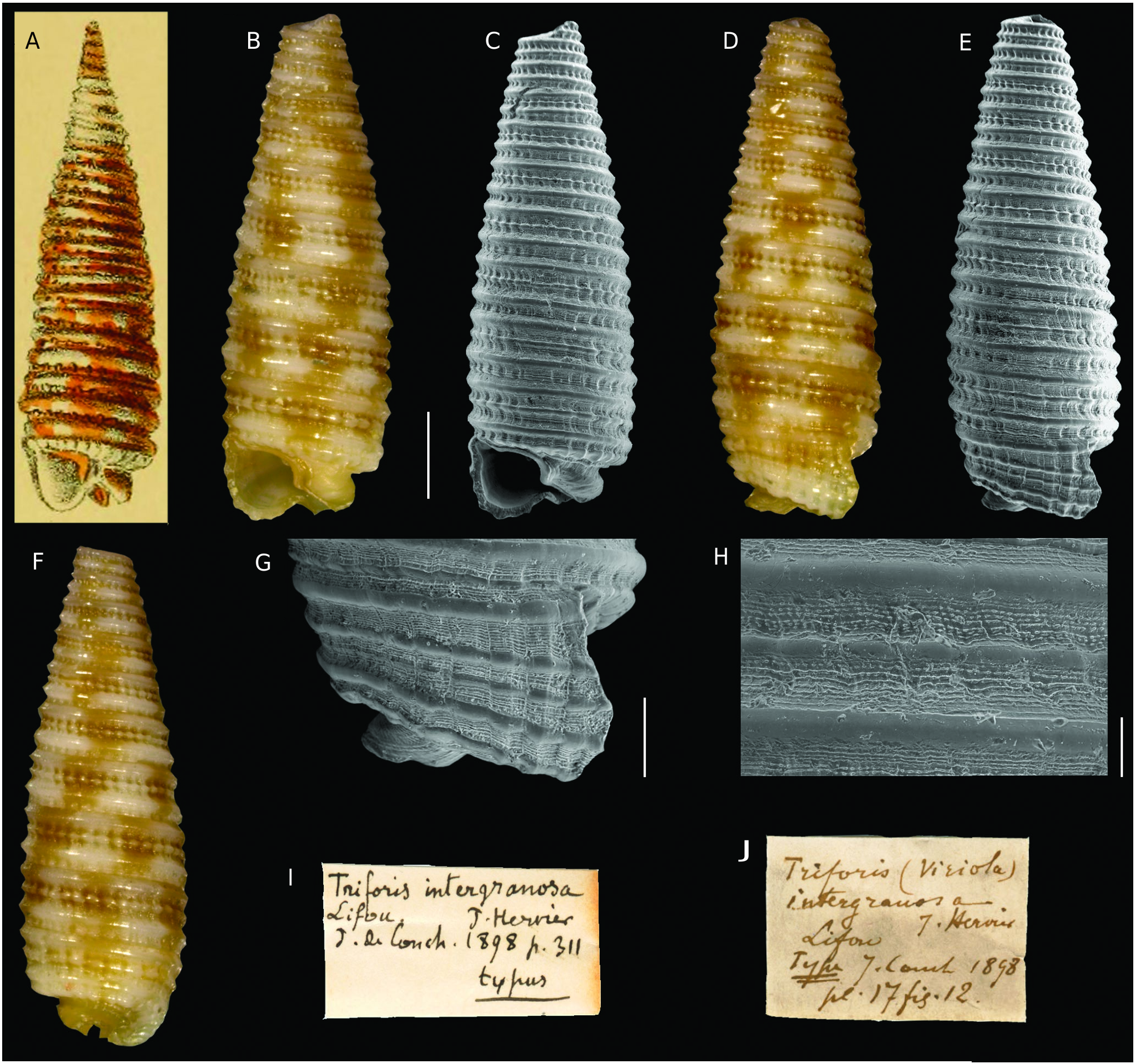 FIG. 17. — Triforis (Viriola) intergranosa Hervier, 1898, Lifou, New Caledonia: A, original figure in Hervier (1898); B-H, syntype, MNHN-IM-2000-1314; front (B, C), side (D, E), back (F), peristome (G), microsculpture (H); I, J, original label. Scale bars: B-F, 1 mm; G, H, 0.5 mm.