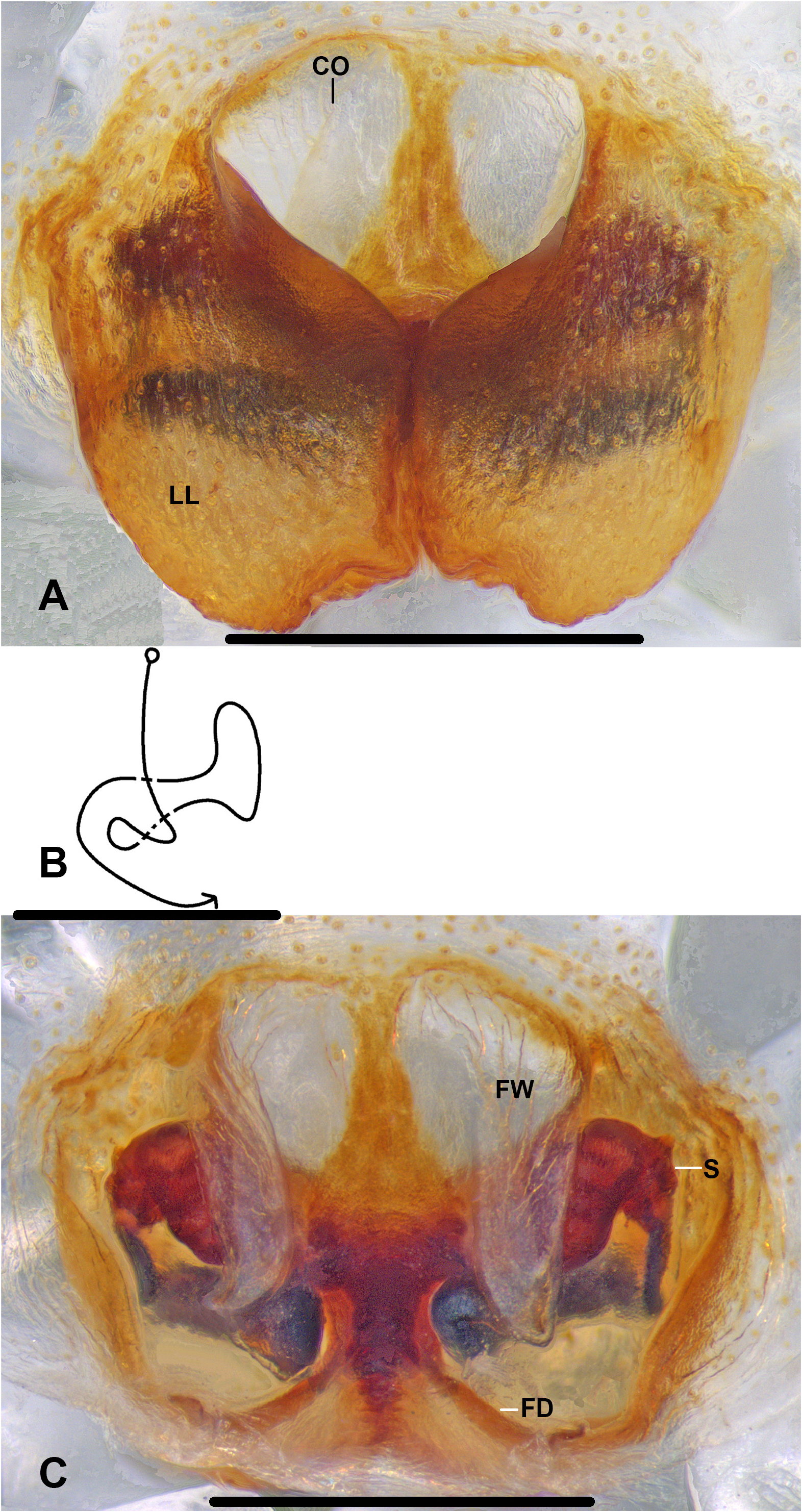 FIGURE 33. Pseudopoda bifaria Zhang, Jäger & Liu, spec. nov., holotype, female: A. Epigyne, ventral; B. Schematic course of IDS, dorsal; C. Vulva, dorsal. Scale bars: A–C: 0.5 mm.