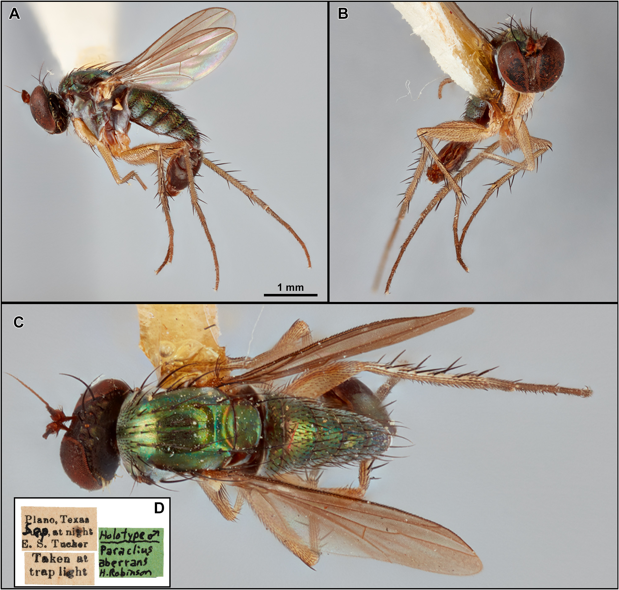 FIGURE 6. Paraclius aberrans Robinson, male holotype (NMNH). A–C. Habitus in lateral, anterior and dorsal views, respectively; D. Labels. Images B and C originally lacked scale bars. Photographs by Alyssa Seemann, NMNH.