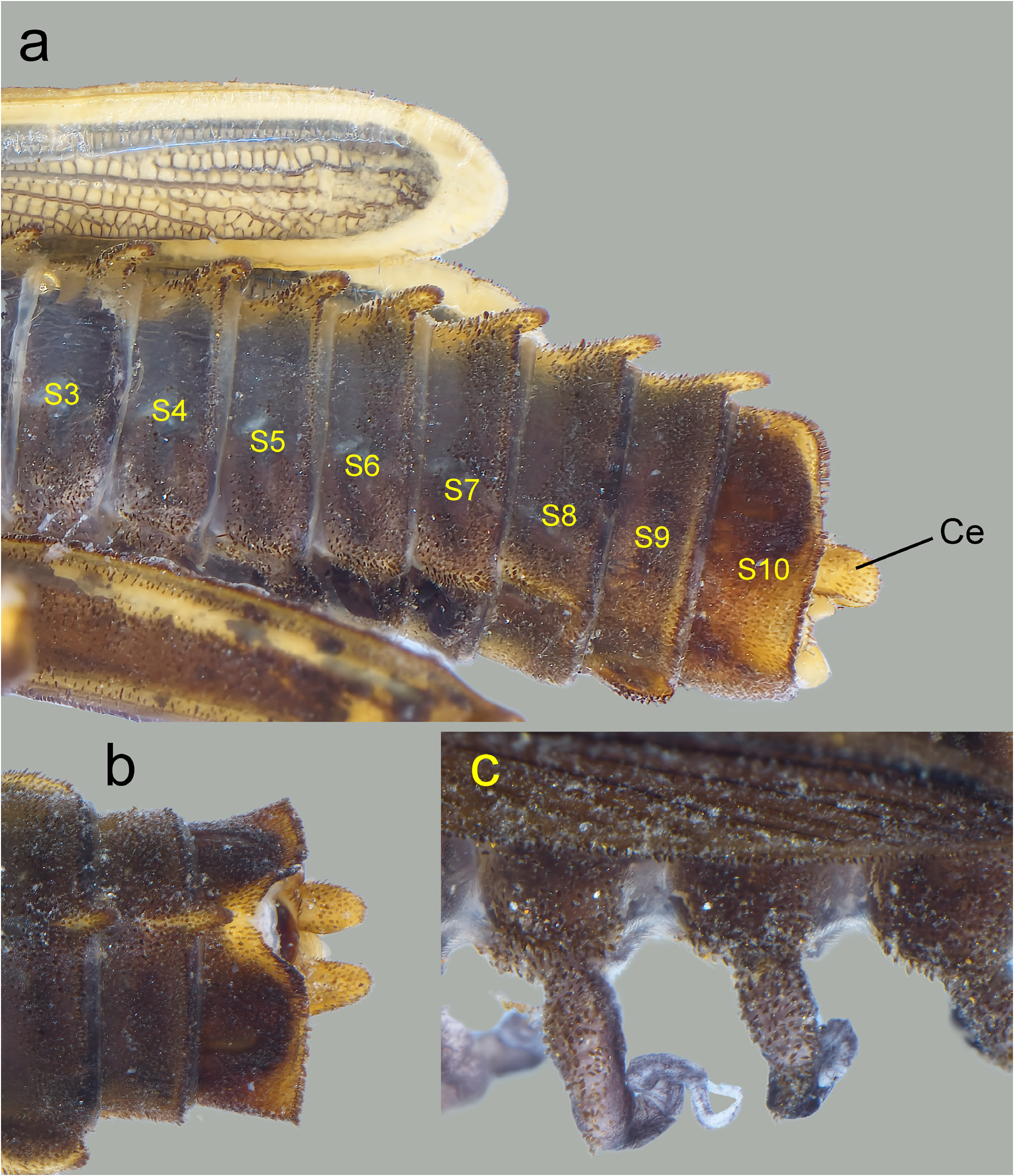 FIG. 4. Cora inca, details of larval morphology, a) Abdomen profile, male left lateral view; b) S8–10 and male cerci, dorsal view; c) detail of two lateroventral gills showing basal half covered with scale-like setae and distal portion coiled, lateral view.