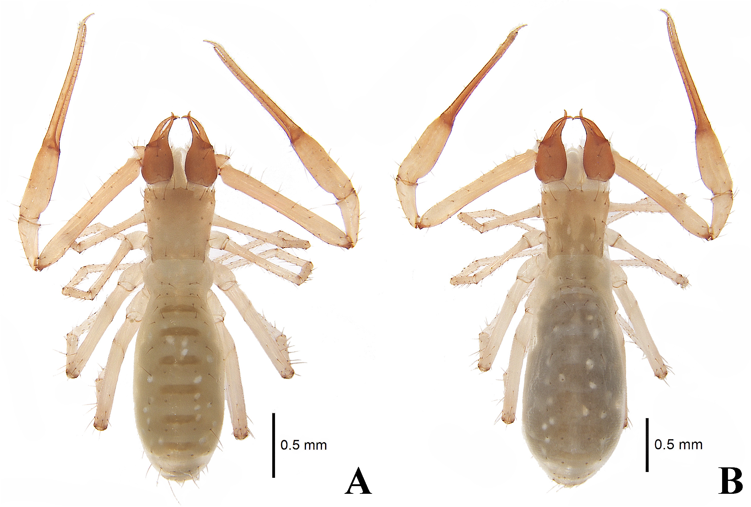 FIGURE 112. Tyrannochthonius quattuor sp. nov., A. Holotype male, habitus (dorsal view); B. Paratype female, habitus (dorsal view).