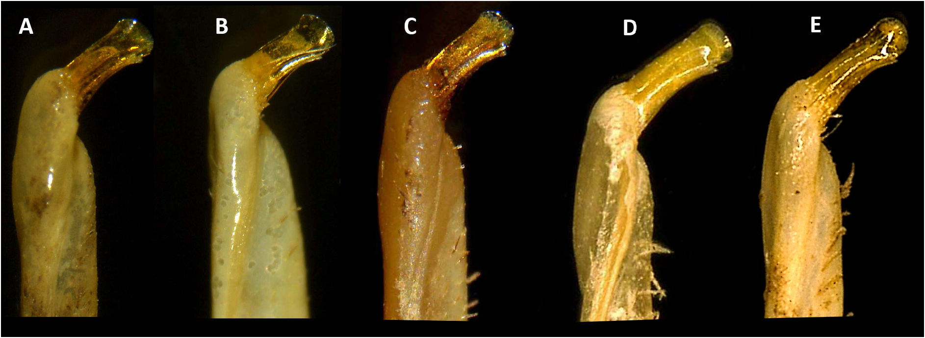Fig. 11. Dorsal view of right G1, apical corneous part in A, Leptarma bertrandi, new species, holotype, male (21.4 × 19.3 mm) (MNHN- IU-2022-384), Loyalty Islands; B, Leptarma bertrandi, new species, male (14.5 × 12.5 mm) (ZRC 2019.1331), Vanuatu; C, Leptarma bertrandi, new species, male (18.3 × 16.2 mm) (ZRC 2019.1079), Taiwan; D, Leptarma lenzii (De Man, 1895), lectotype, male (27.0 × 11.28 mm) (Leiden, ZAM CRUS. D. 102653); E, Leptarma lenzii (De Man, 1895), male (11.8 × 9.9 mm) (ZRC 2018.1373), Cocos (Keeling) Islands.