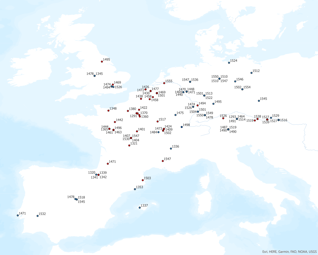 Map of Extant Court Ordinances issued between 1300-1556 in Western- and Central Europe.
