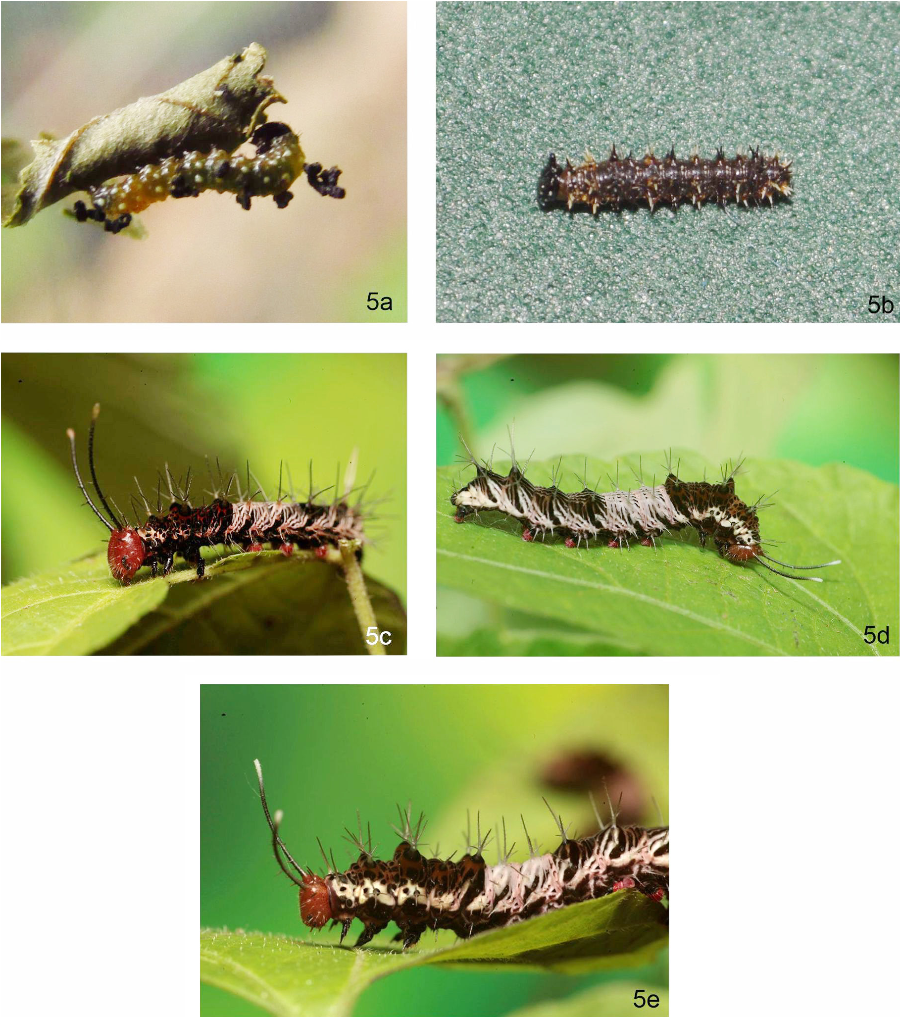 Figura 5. Larva de Hamadryas chloe chloe (Stoll, 1787). a) Instar 1. b) Instar 2. c) Instar 3. d) Instar 4. e) Instar 5.