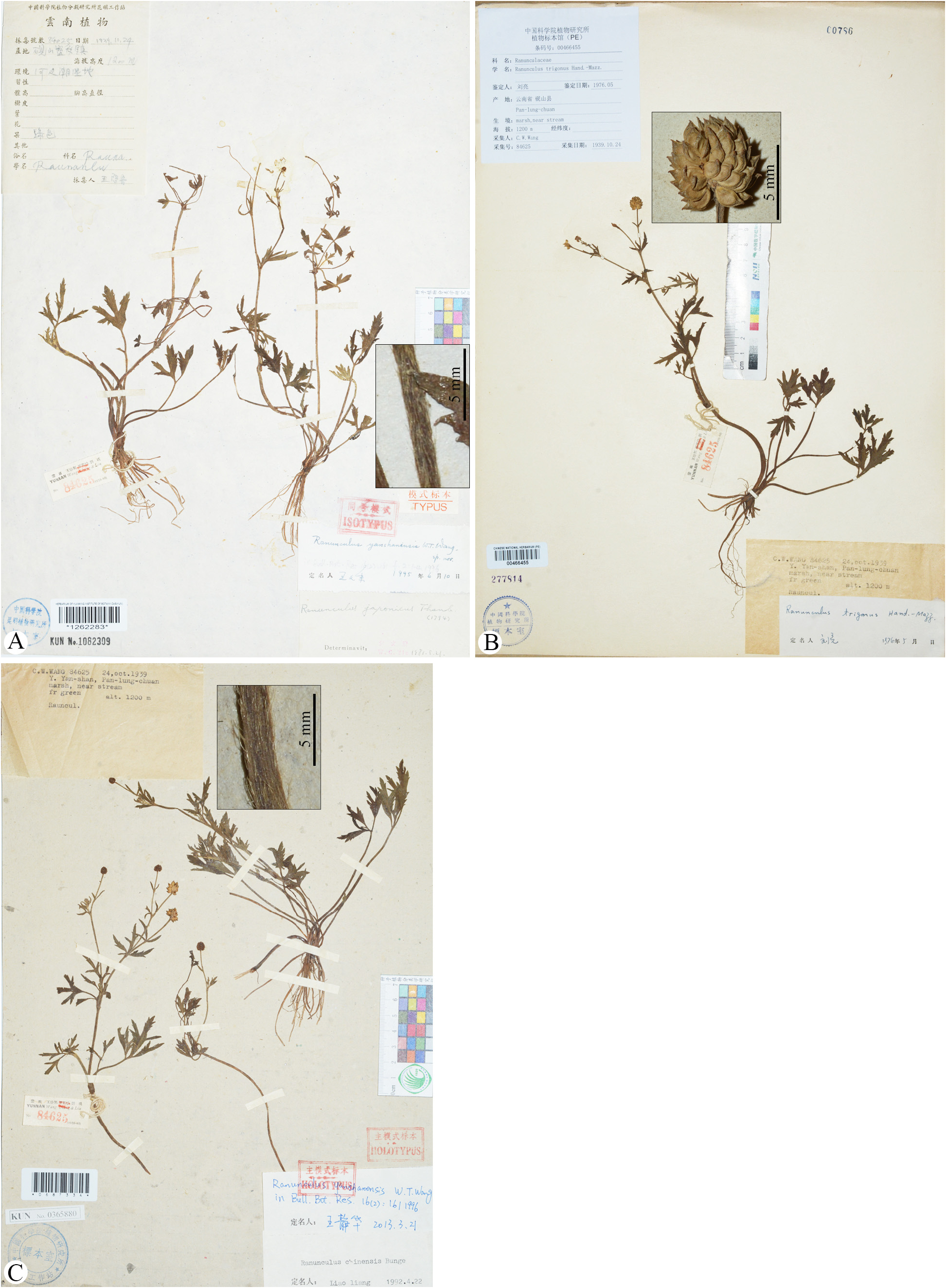 FIGURE 1. Holotype (A) and isotype (B, C) sheets of Ranunculus yanshanensis (= R. trigonus). A. Inset: portion of subappressed hirsute petiole. B. Inset: globose aggregate fruit. C. Inset: portion of subappressed hirsute stem.