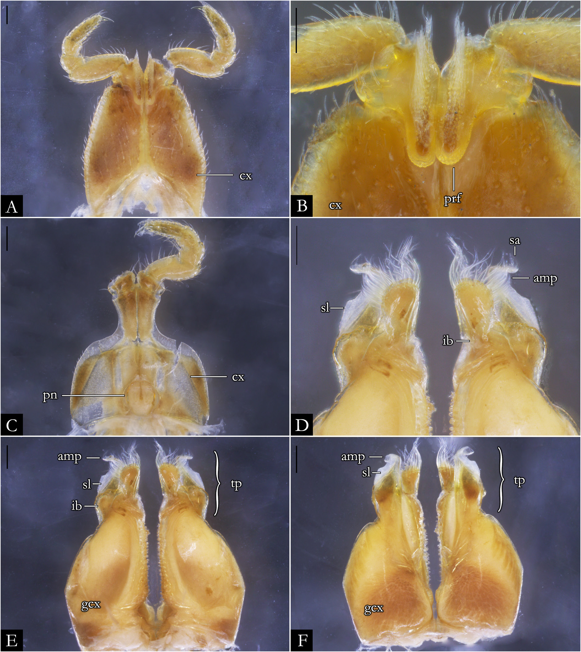 Fig. 156. Pseudonannolene insularis sp. nov., ♂ (IBSP 1233). A. First leg-pair. B. Detail of prefemur. C. Second leg-pair. D. Detail of telopodites, in anal view. E. Gonopods, in anal view. F. Gonopods, in oral view. Abbreviations: see Material and methods. Scale bars = 0.2 mm.