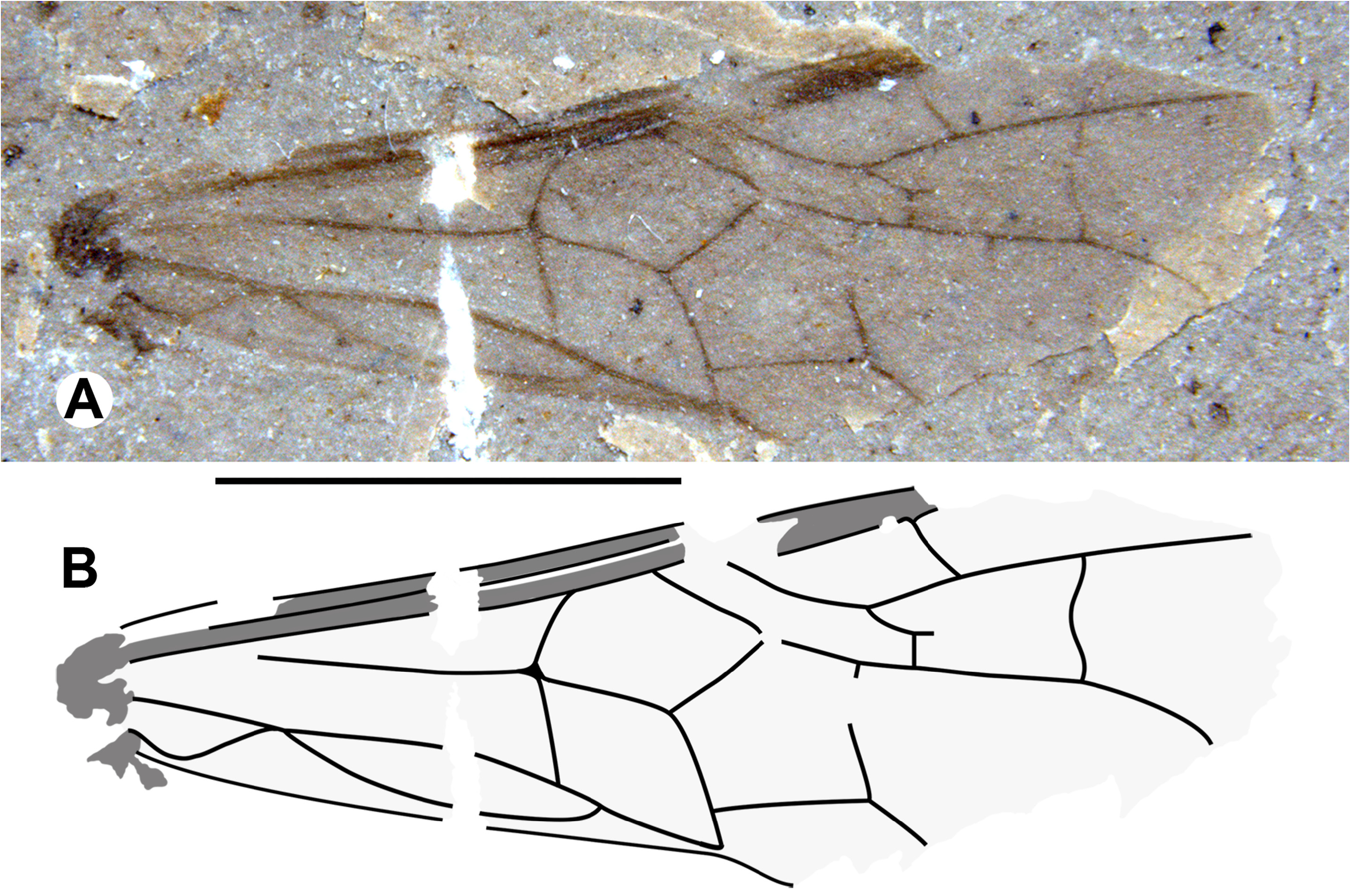 FIGURE 18. GSC 142842, tentative Leptostigma longitenebricum forewing: A, photograph; B, drawing. Scale bar 5 mm.