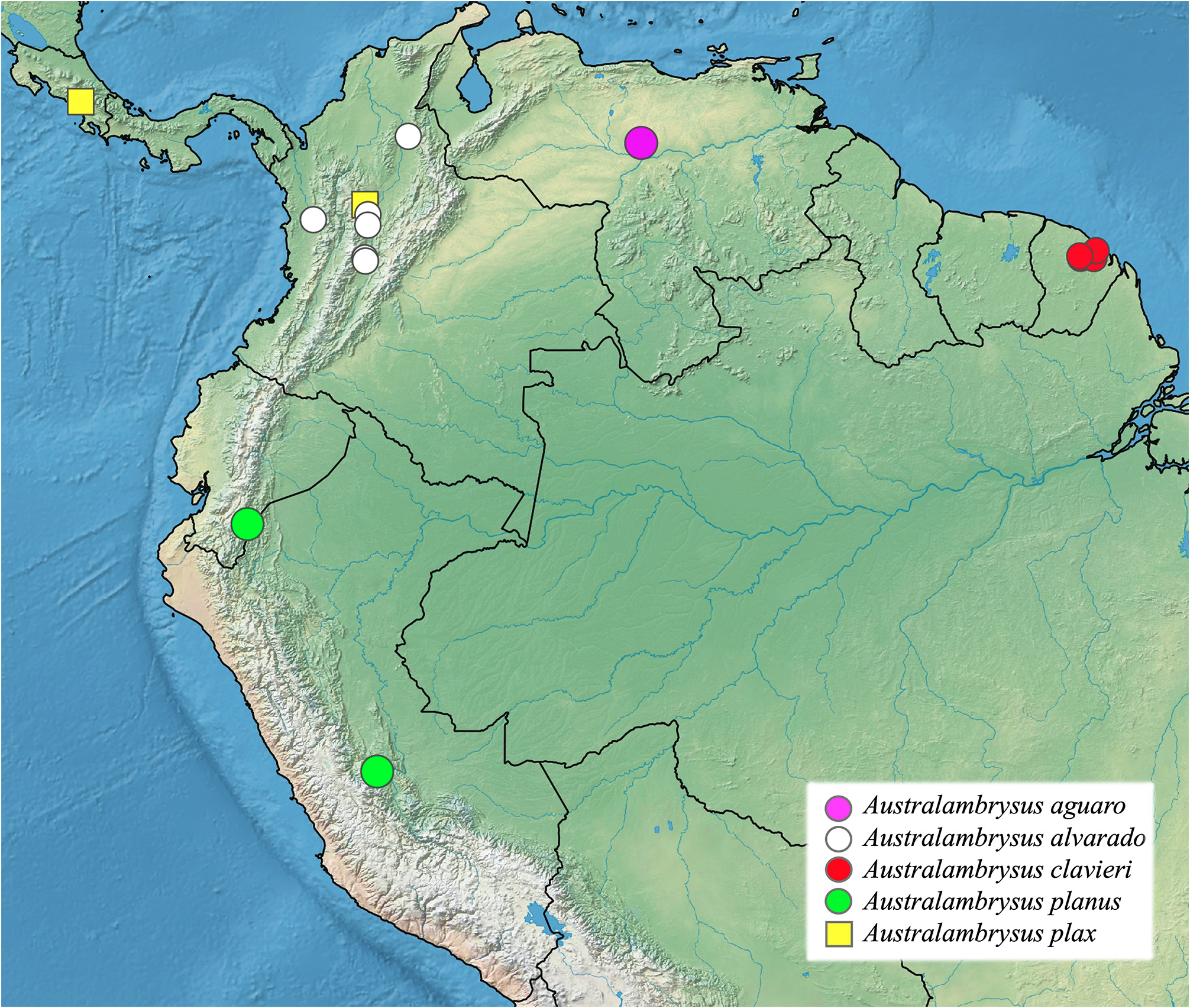 FIGURE 9. Distribution records of species in the Australambrysus plax species complex.