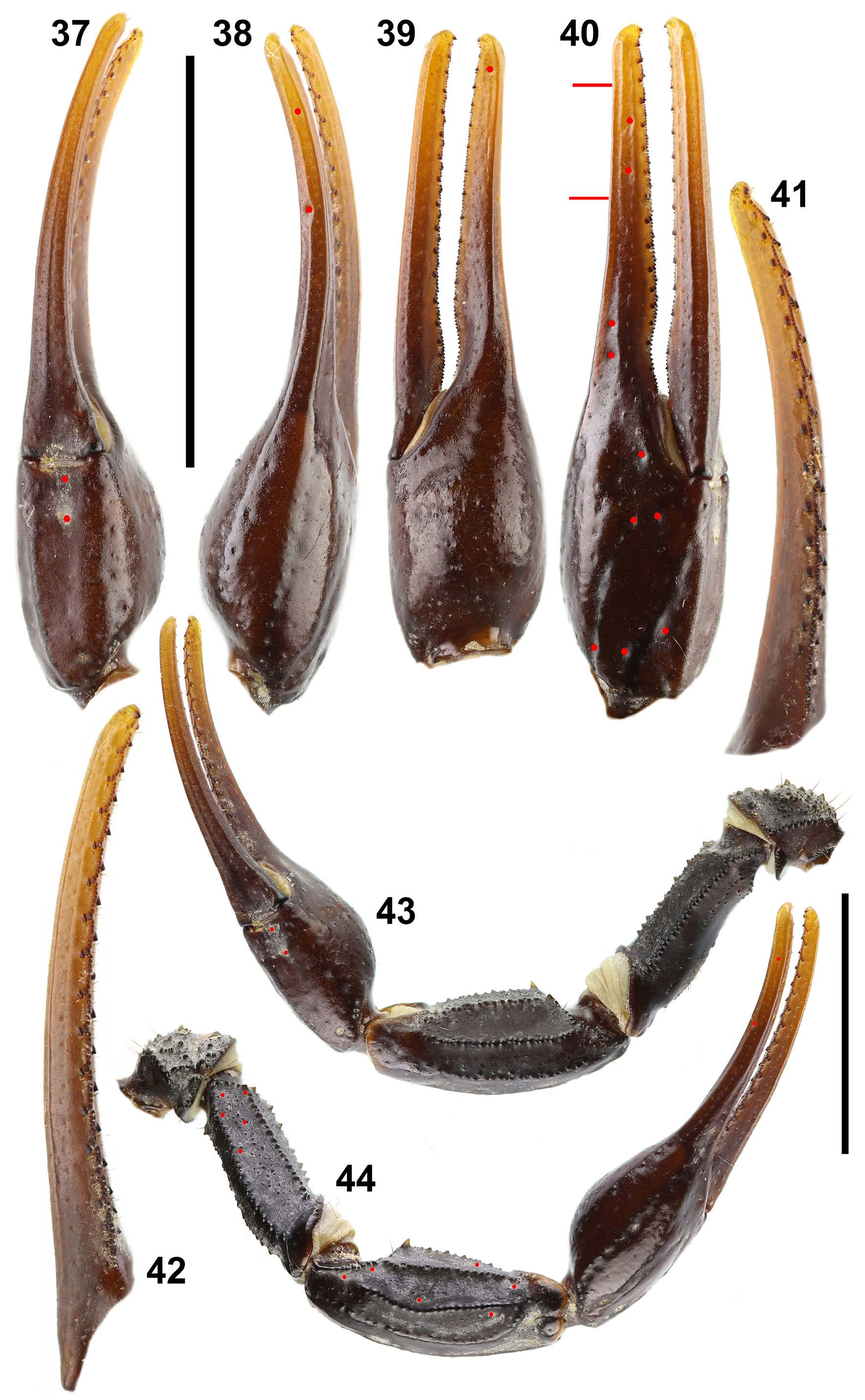 Figures 37–44. A. kunti sp. n., female paratype pedipalp segments. Chela ventral (37), dorsal (38), internal (39) and external (40) views Movable (41) and fixed (42) fingers dentition. Pedipalp ventral (43), dorsal (44). Trichobothrial pattern is indicated by red circles. Scale bar: 10 mm.