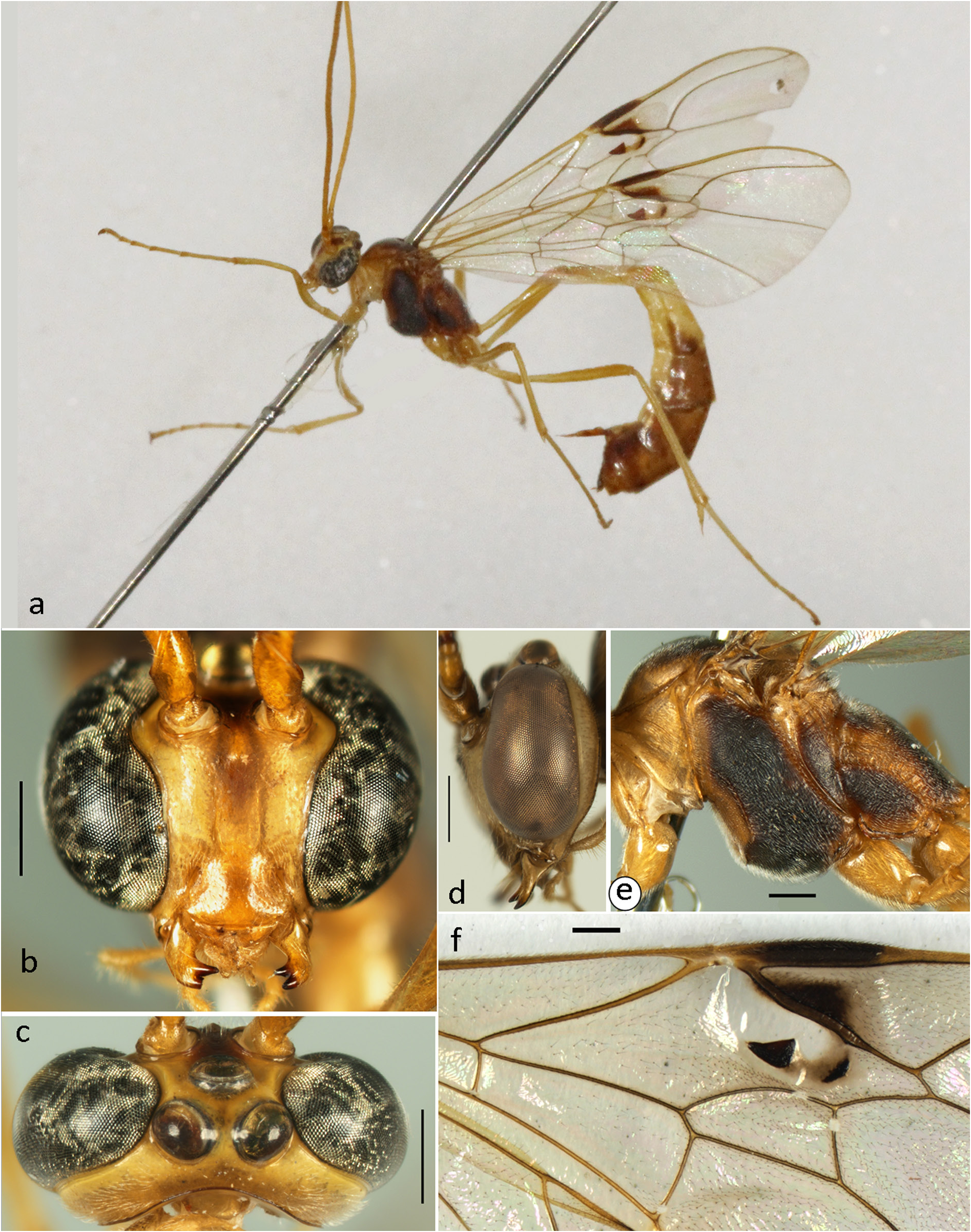 Fig. 11. Enicospilus bakerielli Gauld & Mitchell, 1981, ♀ (IEBR). a. Habitus. b. Head, frontal view. c. Head, dorsal view. d. Head, lateral view. e. Mesosoma, lateral view. f. Central part of fore wing. Scale bars = 0.5 mm.