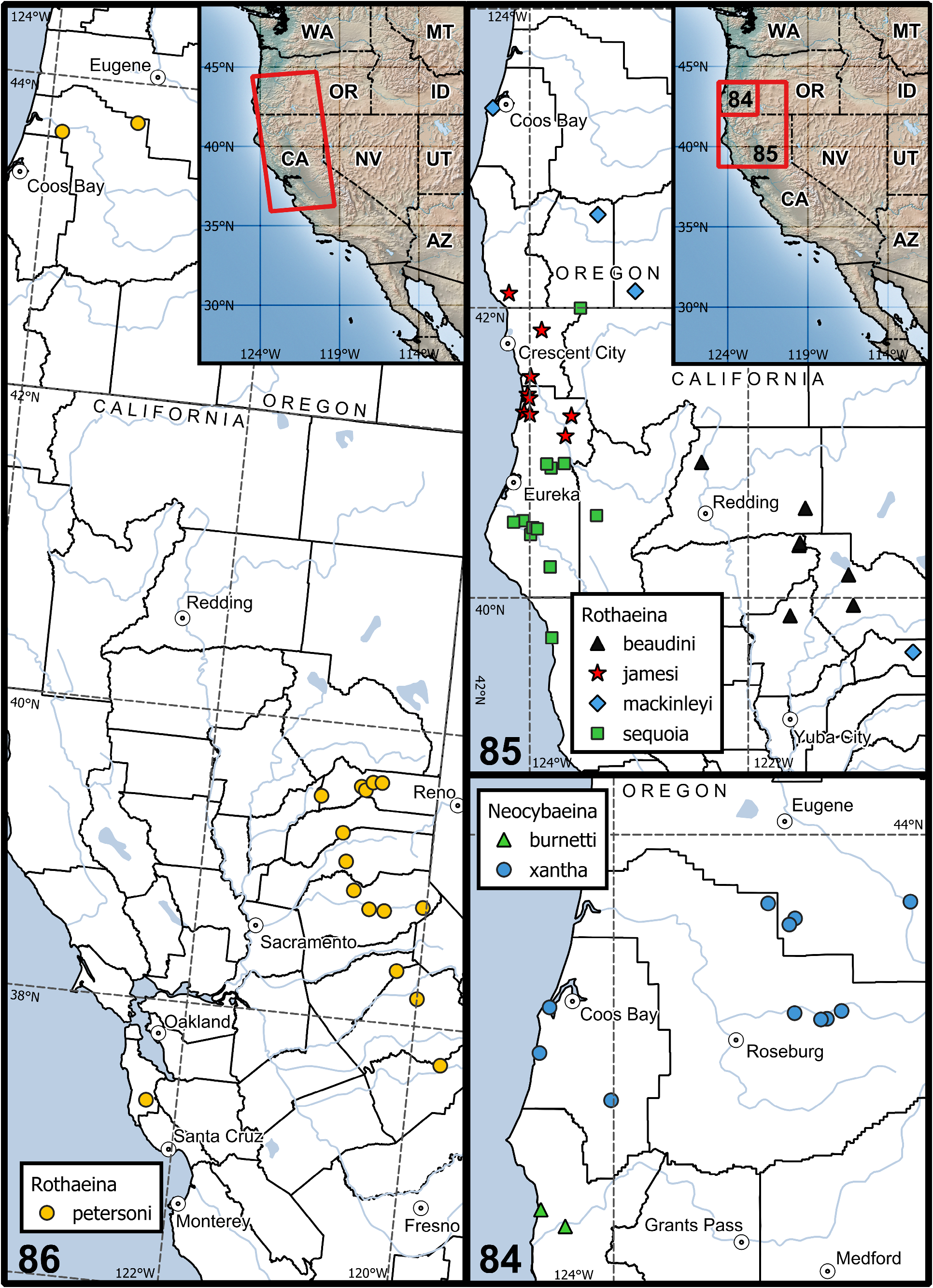 FIGURES 84–86. Distributions of Neocybaeina gen. nov. and Rothaeina gen. nov. species (84 Neocybaeina burnetti spec. nov. and N. xantha comb. nov.; 85 Rothaeina beaudini spec. nov., R. jamesi spec. nov., R. mackinleyi spec. nov., and R. sequoia comb. nov.; 86 Rothaeina petersoni spec. nov.) AZ—Arizona, CA—California, ID—Idaho, MT—Montana, OR—Oregon, NV—Nevada, UT—Utah, WA—Washington.