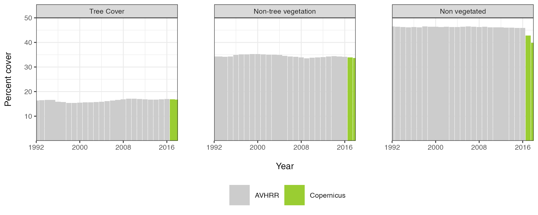 Song's VCF dataset includes data on generic categories, namely “tree cover”, “non-tree vegetation”, and “non vegetated”. Given the Copernicus dataset has a higher thematic detail, we first aggregated these data into comparable classes. We created a “Non-tree vegetation” layer (i.e. total per-pixel proportion of crops, grasses, shrubs, and mosses), and a “Non Vegetated” layer (i.e. total per-pixel proportion of bare land, permanent water, urban, and snow). Independent data on “Tree cover” was already present.