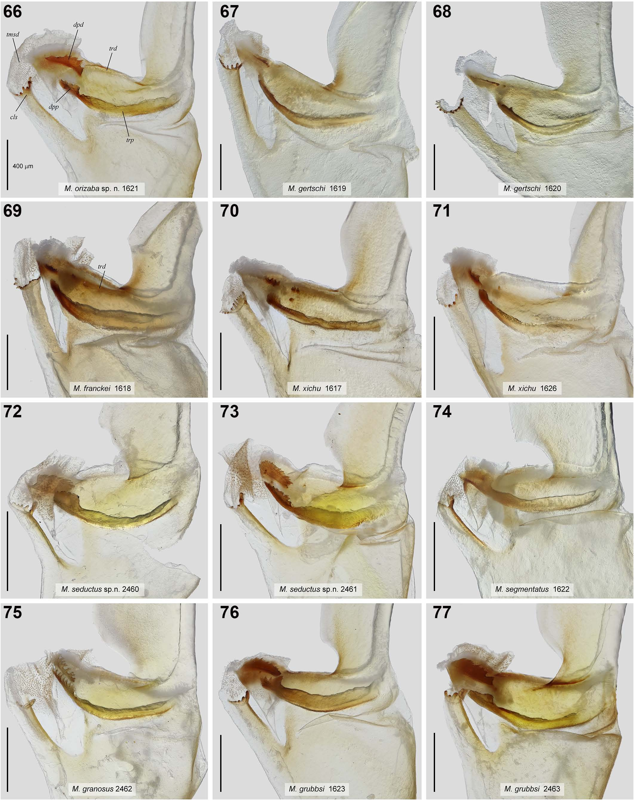 Figures 66–77. Hemispermatophore capsules of Megacormus. 66. M. orizaba sp. n. (holotype, No. 1621). 67–68. M. gertschi (Nos. 1619, 1620). 69. M. franckei (paratype, No. 1618). 70–71. M. xichu (Nos. 1617, 1626). 72–73. M. seductus sp. n. (holotype and paratopotype, Nos. 2460–2461). 74. M. segmentatus (No. 1622). 75. M. granosus (No. 2462). 76. M. grubbsi (No. 1623). 77. M. grubbsi (No. 2463). Convex views of left capsules (66, 68–71, 73–75 and 77), and right capsules shown in mirror image (67, 72 and 76). Abbreviations: dpd, distal dentate process; dpp, proximal dentate process; cls, crown-like structure; trd, distal transverse ridge; trp, proximal transverse ridge; tmsd, terminal membrane of the sperm duct. Scale bars: 400 μm.
