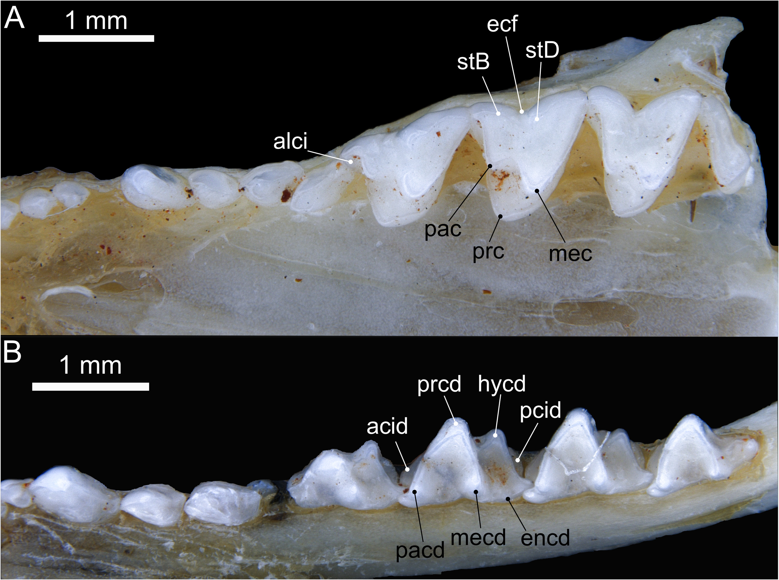 FIGURE 17. Upper and lower dentition of Planigale tealei (WAM M47841, paratype) from canine to M4. A) upper and B) lower dentition in occlusal view. Abbreviations: acid, anterior cingulid; alci, anterolabial cingulum; ecf, ectoflexus; encd, entoconid; hycd, hypoconid; mec, metacone; mecd, metaconid; pac, paracone; pacd, paraconid; pcid, posterior cingulid; prc, protocone; prcd, protoconid; stB, stylar cusp B; stD, stylar cusp D.