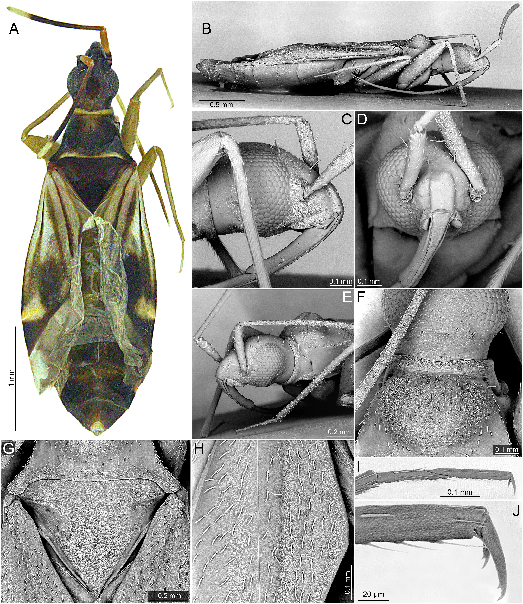 FIGURE 1. Fulvius attenboroughi sp. nov. dorsal view (A) lateral view (B), head, lateral view (C), head, anterior view (D), antero-lateral view (E), posterior part of head, pronotal collar and anterior lobe of pronotum (F), posterior lobe of pronotum, mesoscutum and scutellum (G), surface of hemelytra (H), mesotarsus in lateral view (I), pretarsal claw (J).