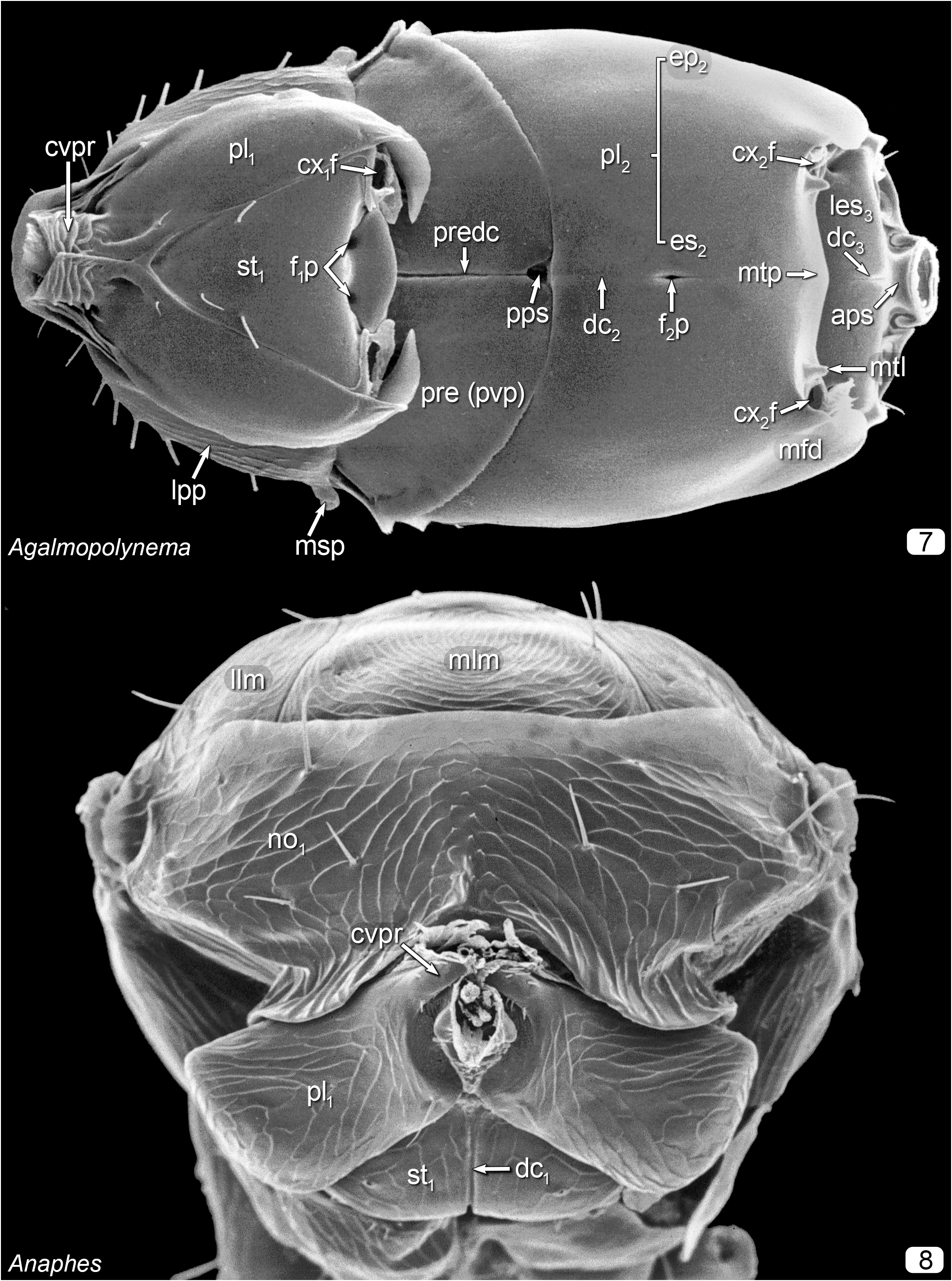 FIGURES 7, 8. Mymaridae, mesosomas. 7, ventral; 8, anterior. Acronyms explained in Appendix 1.